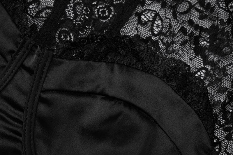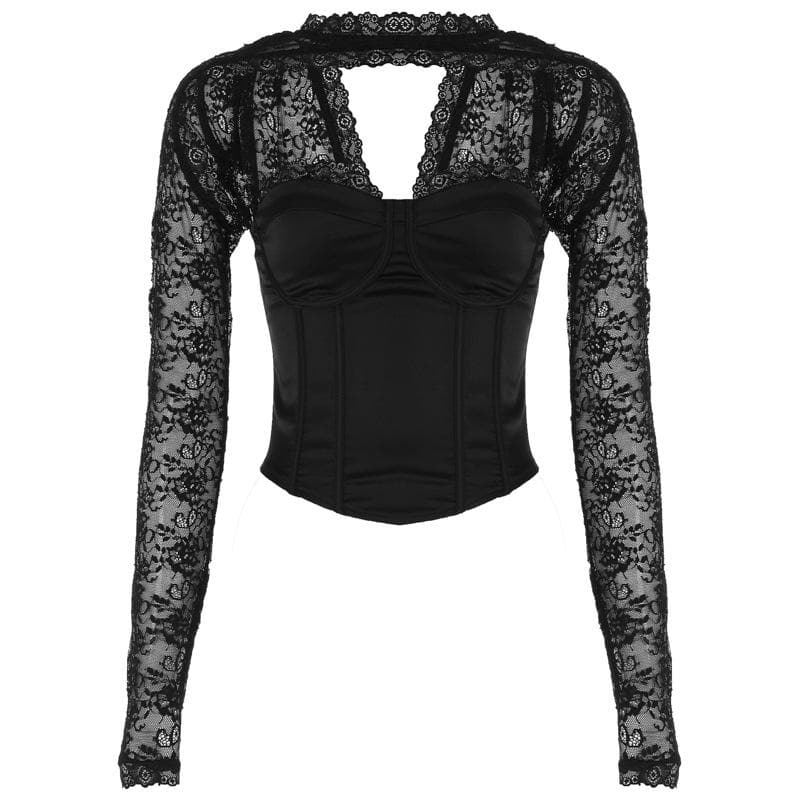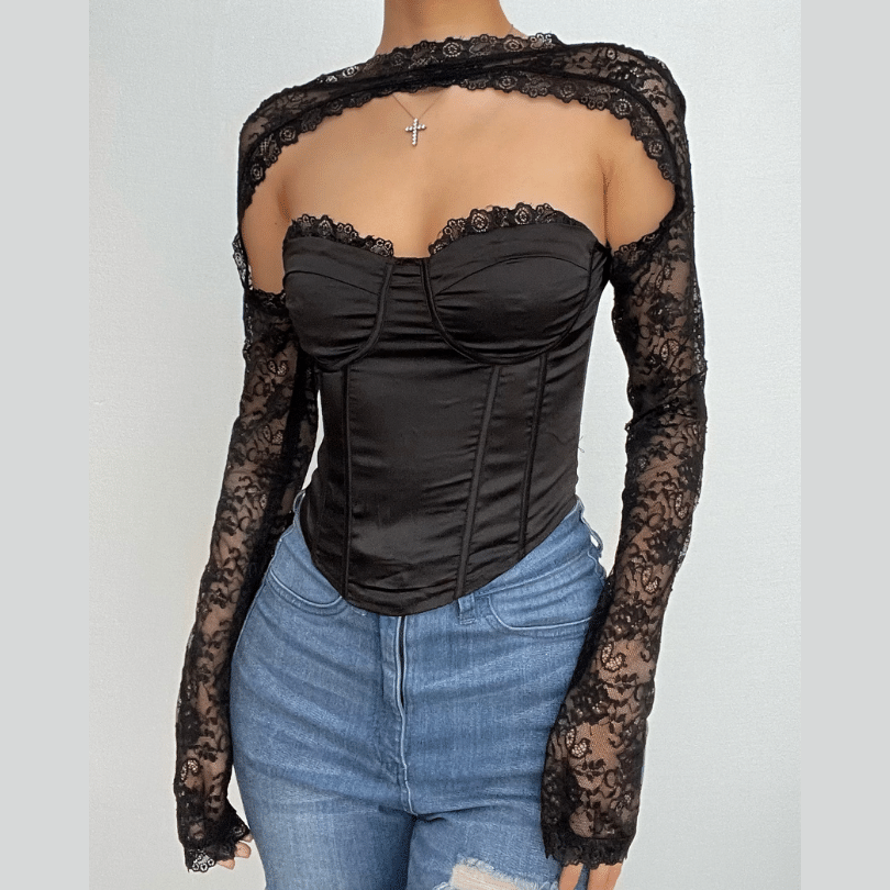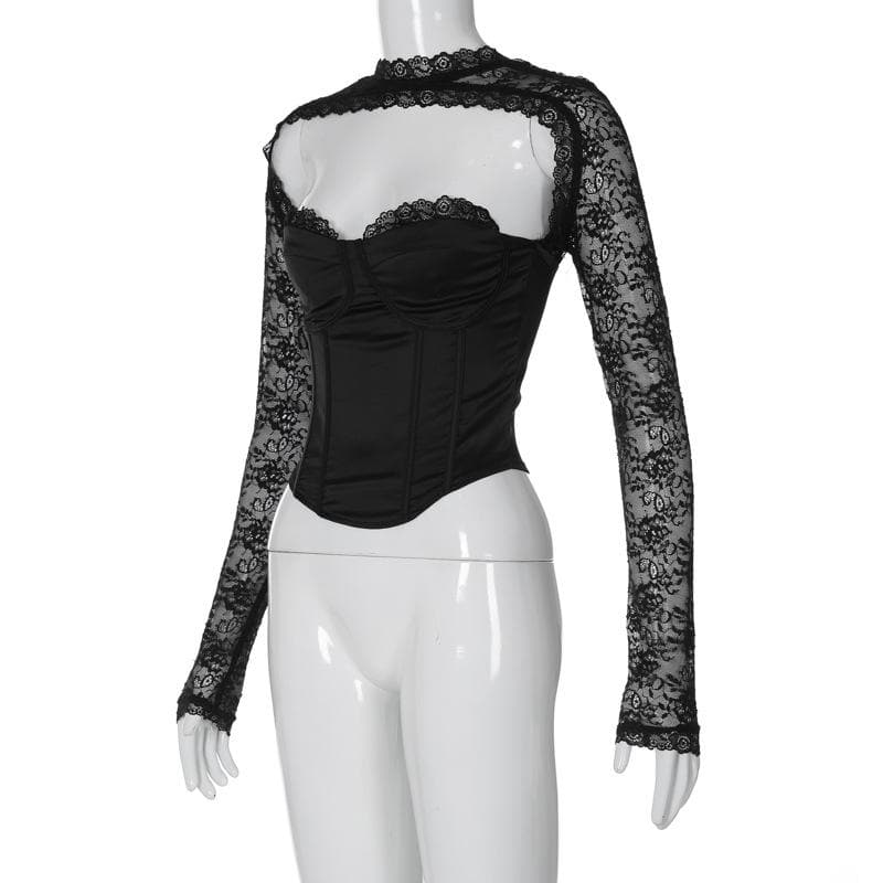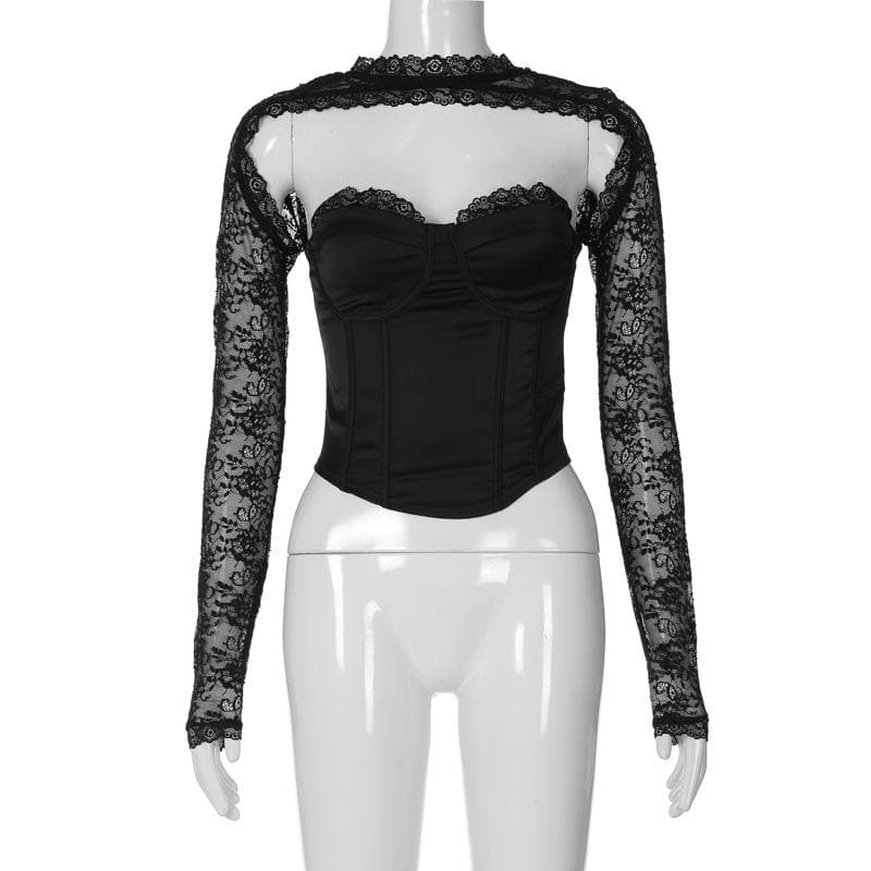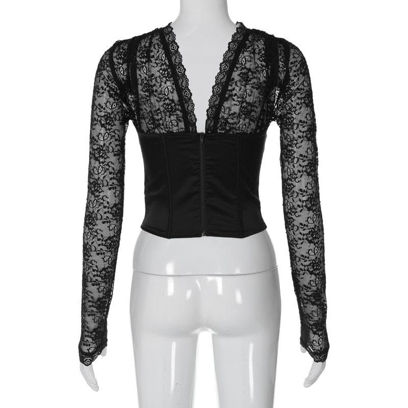 Long sleeve lace zip-up solid backless bustier patchwork top