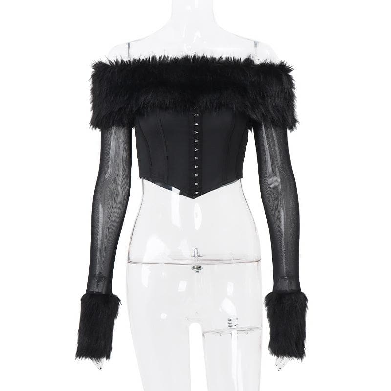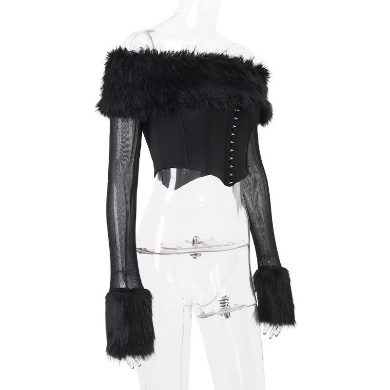 Long sleeve mesh bustier feather button off shoulder bustier crop top