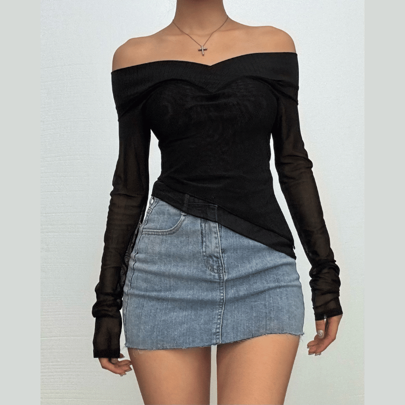 Long sleeve off shoulder mesh ruffle irregular top