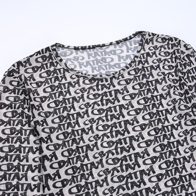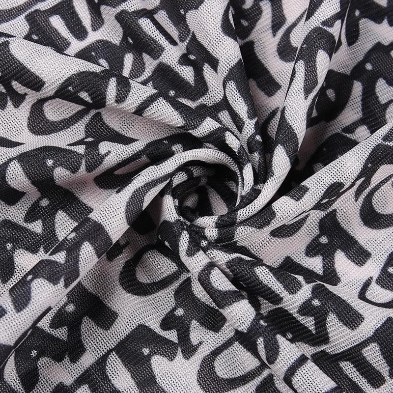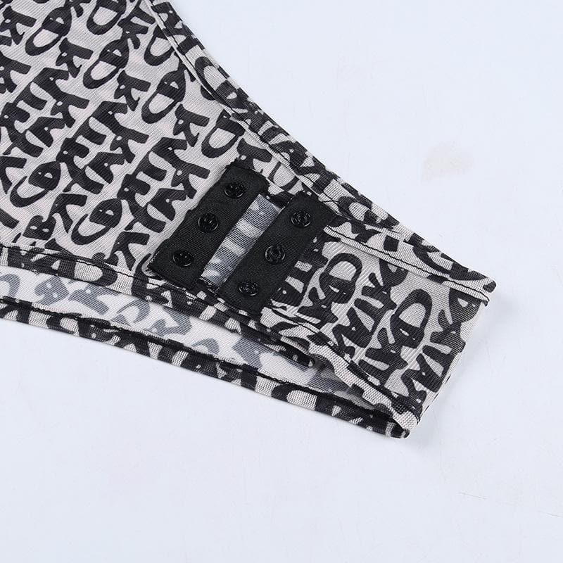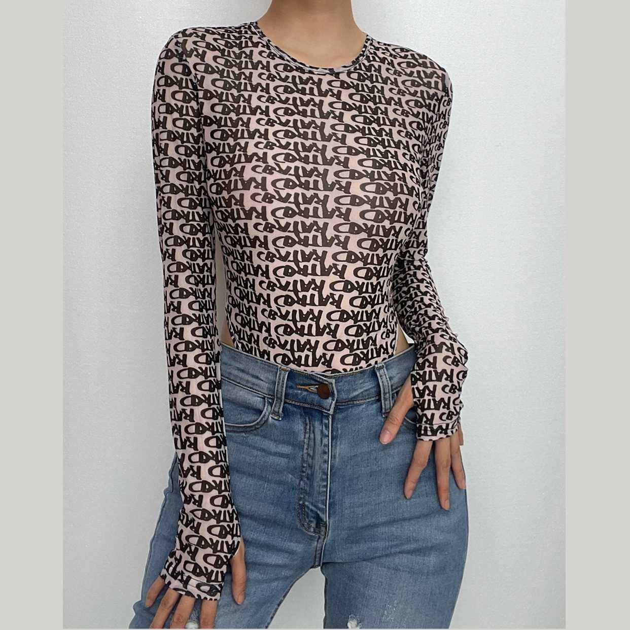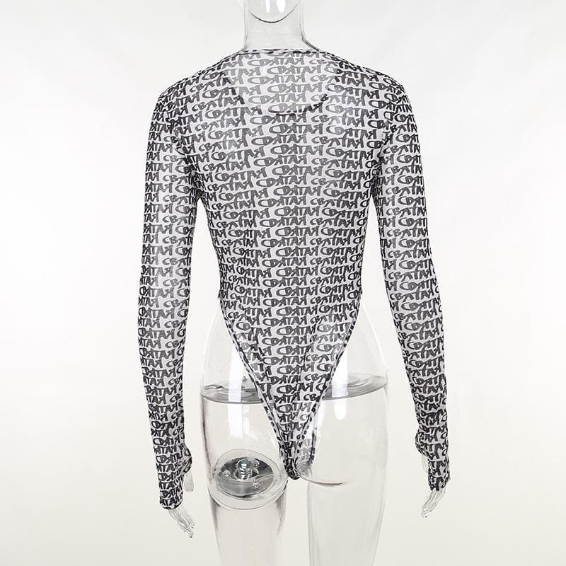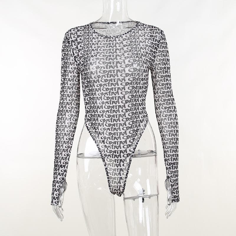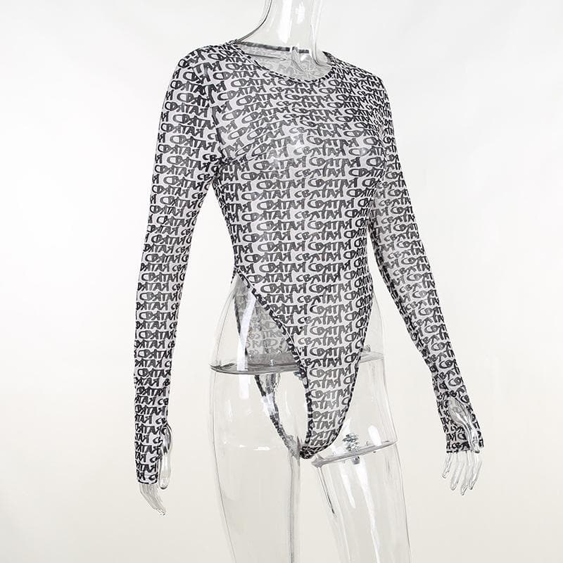 Long sleeve round neck contrast print sheer mesh gloves bodysuit