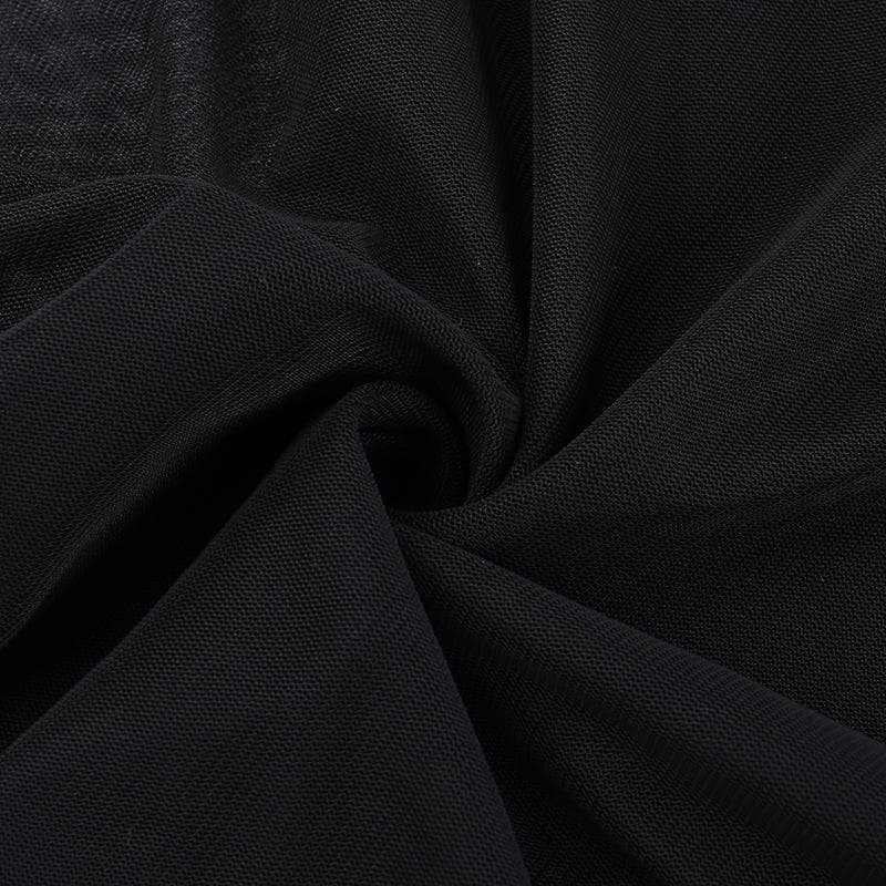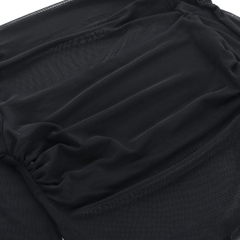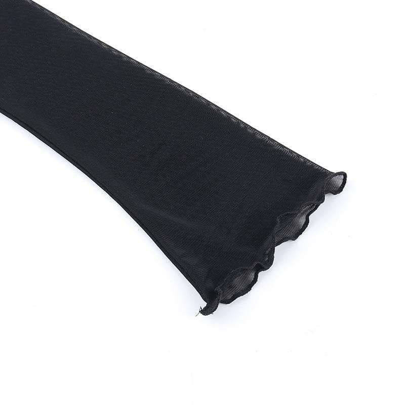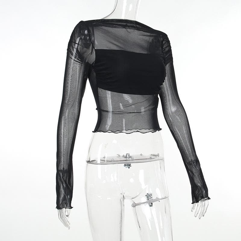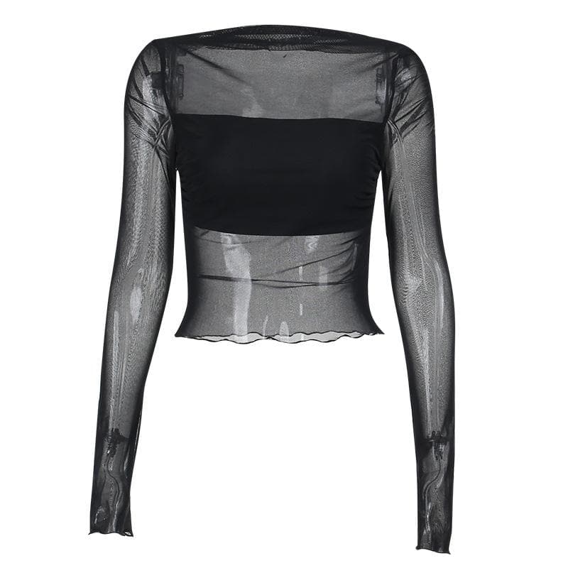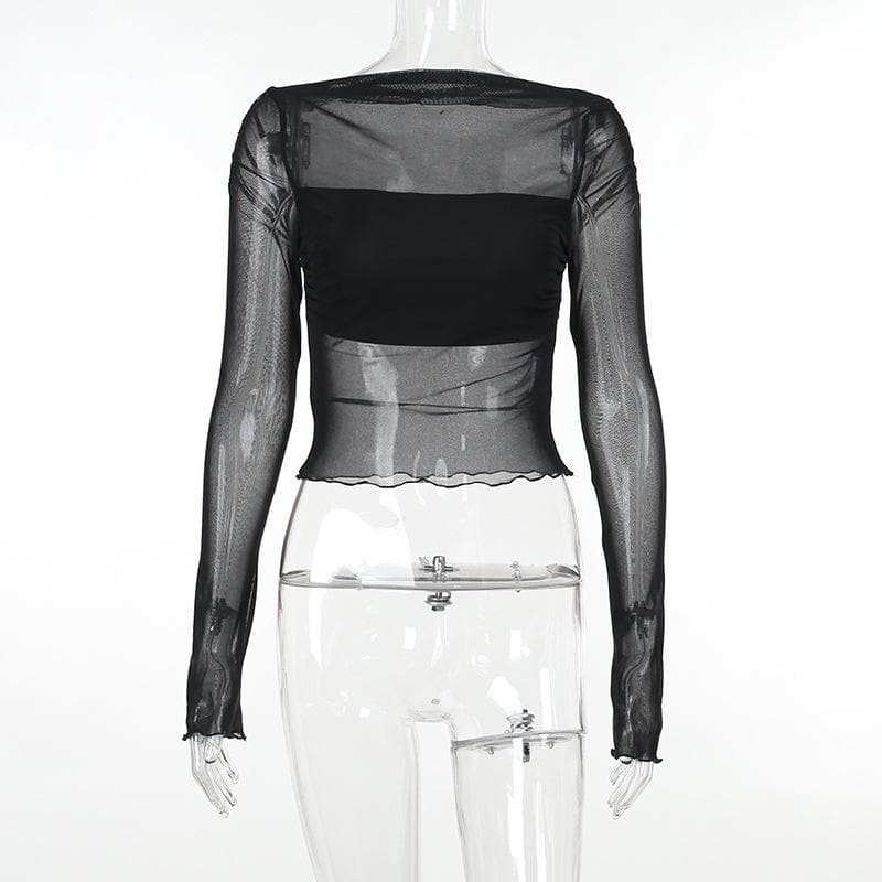 Long sleeve ruffle ruched mesh patchwork solid 2-way top