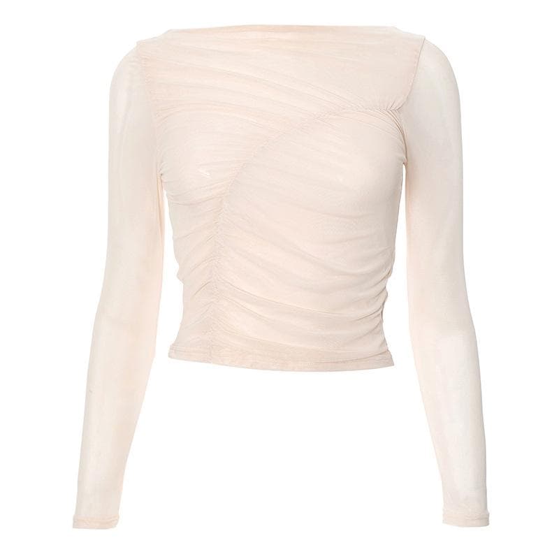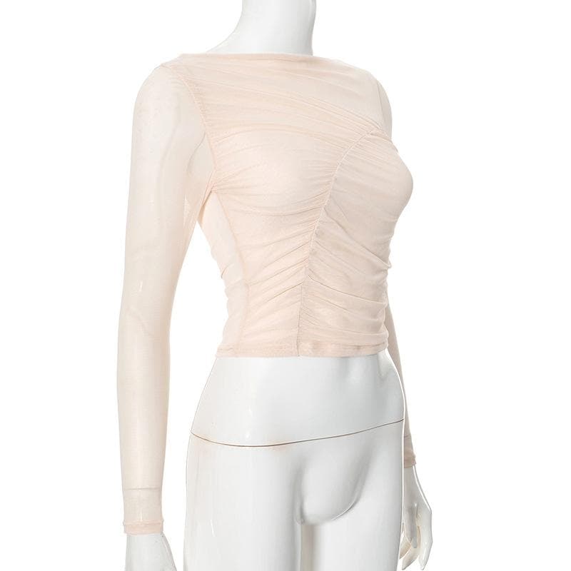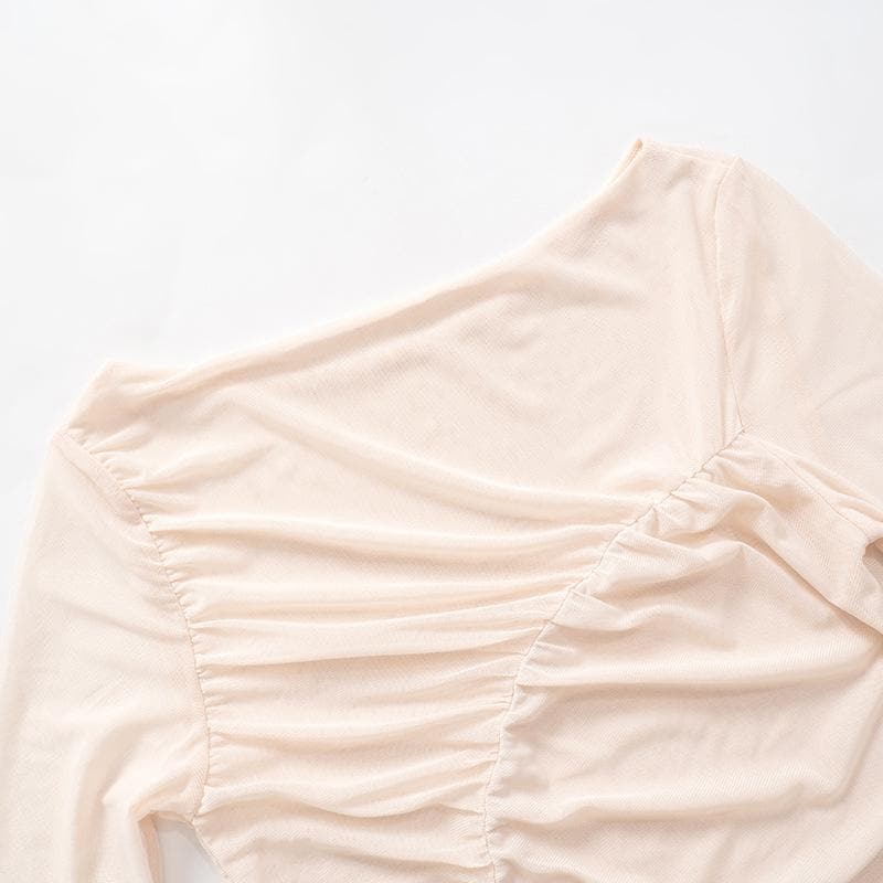 Long sleeve sheer mesh off shoulder ruched crop top