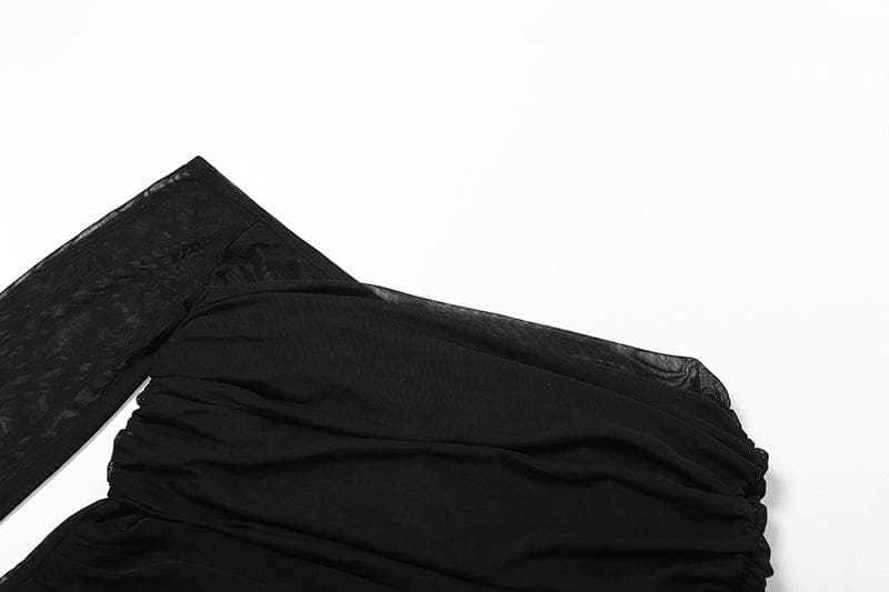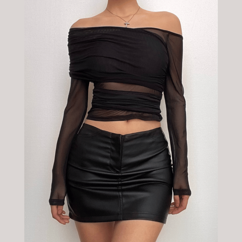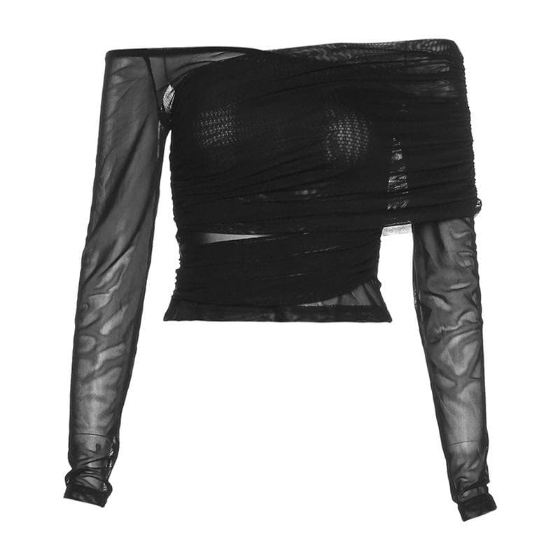 Long sleeve sheer mesh irregular solid off shoulder backless top