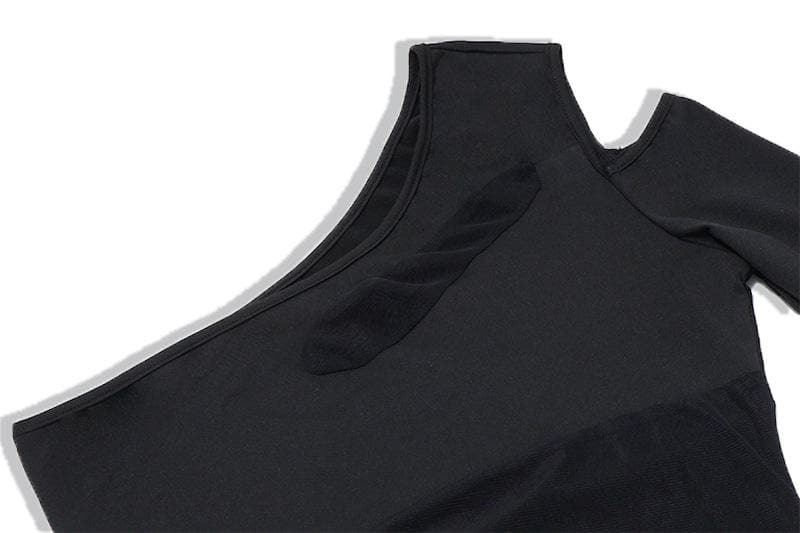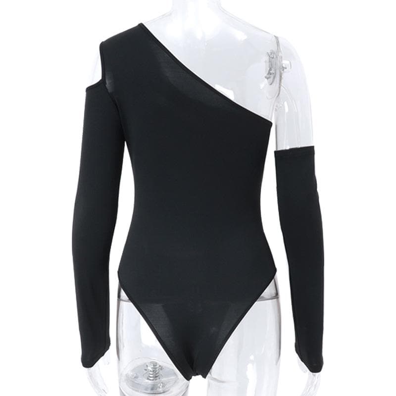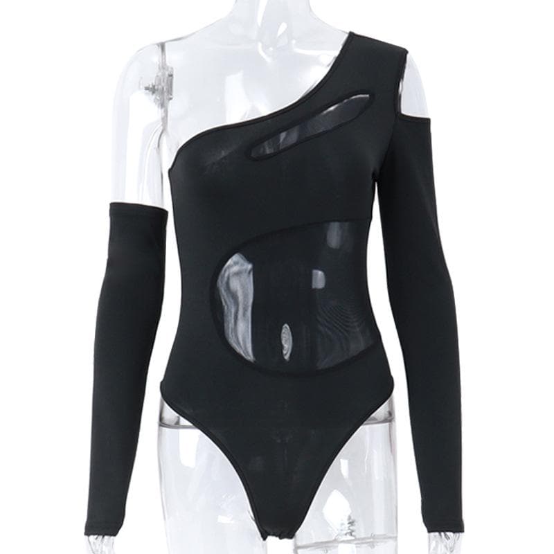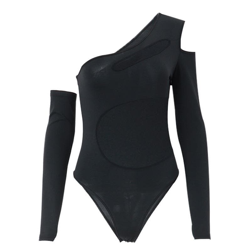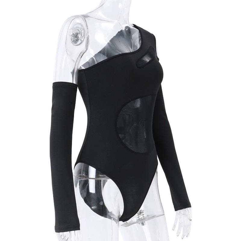 Long sleeve solid mesh backless one shoulder button bodysuit