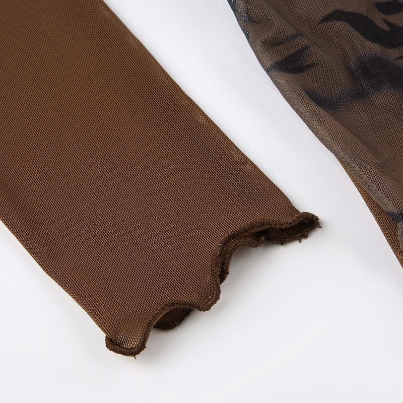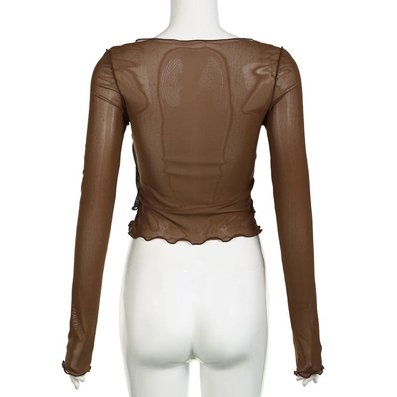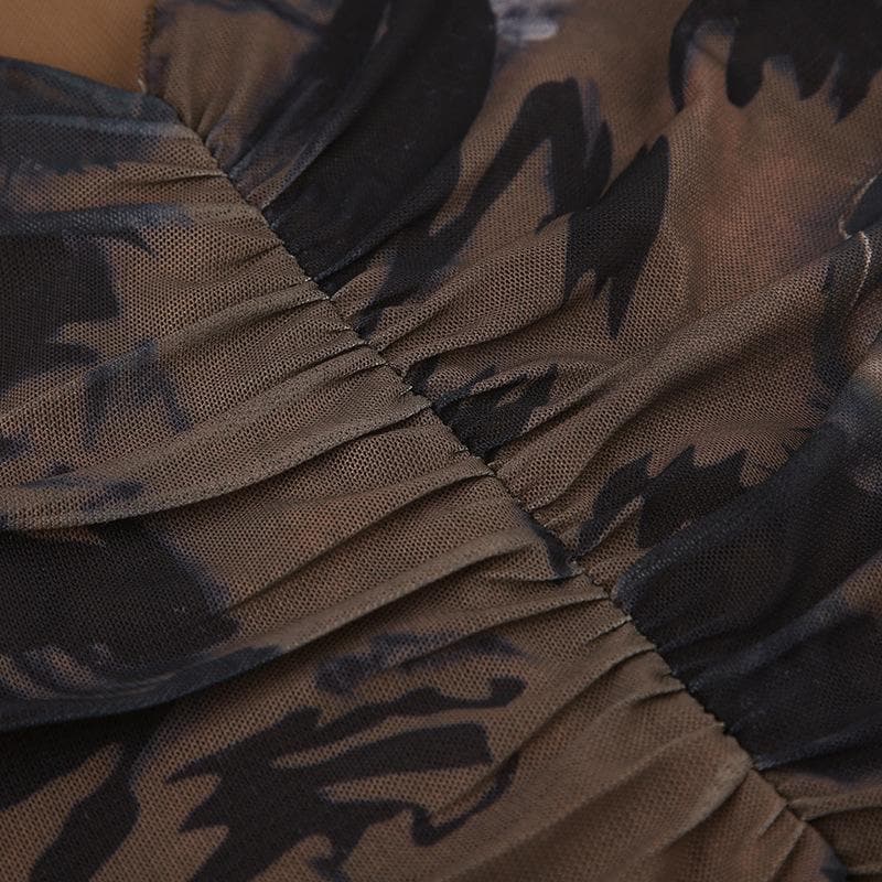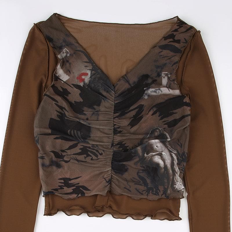 Long sleeve v neck ruched ruffle print sheer mesh stitch top