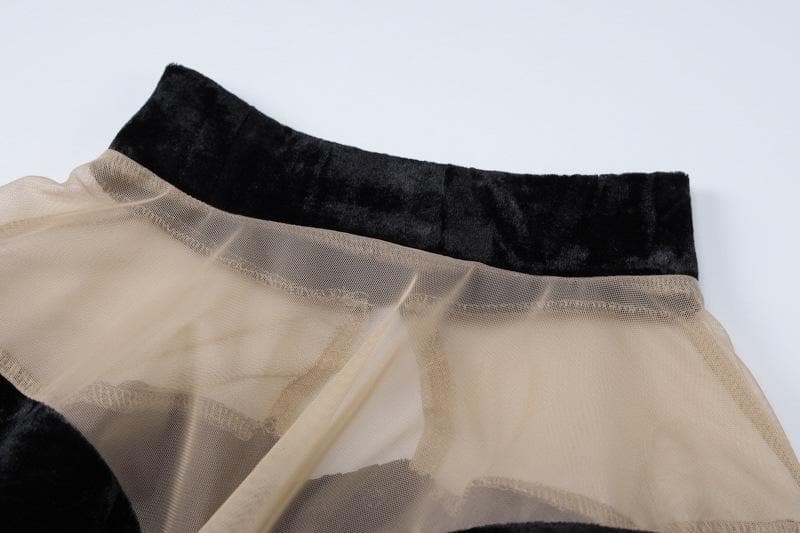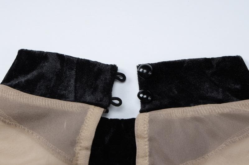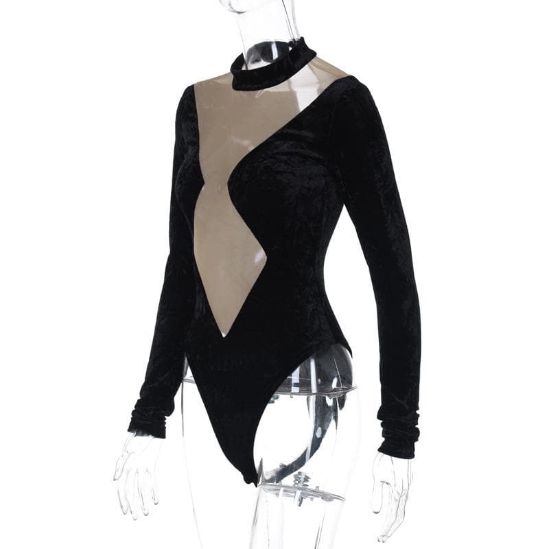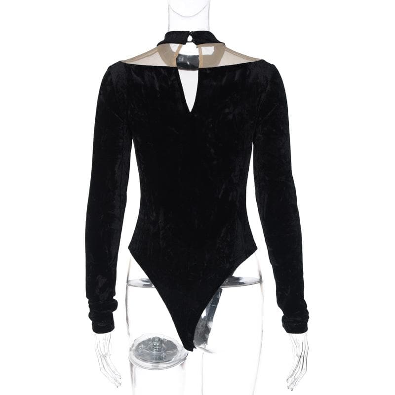 Long sleeve velvet high neck mesh patchwork button bodysuit