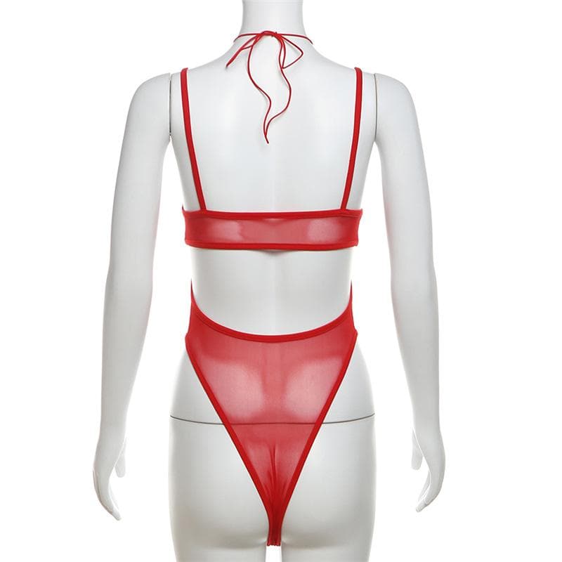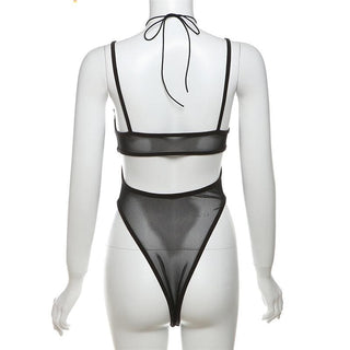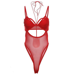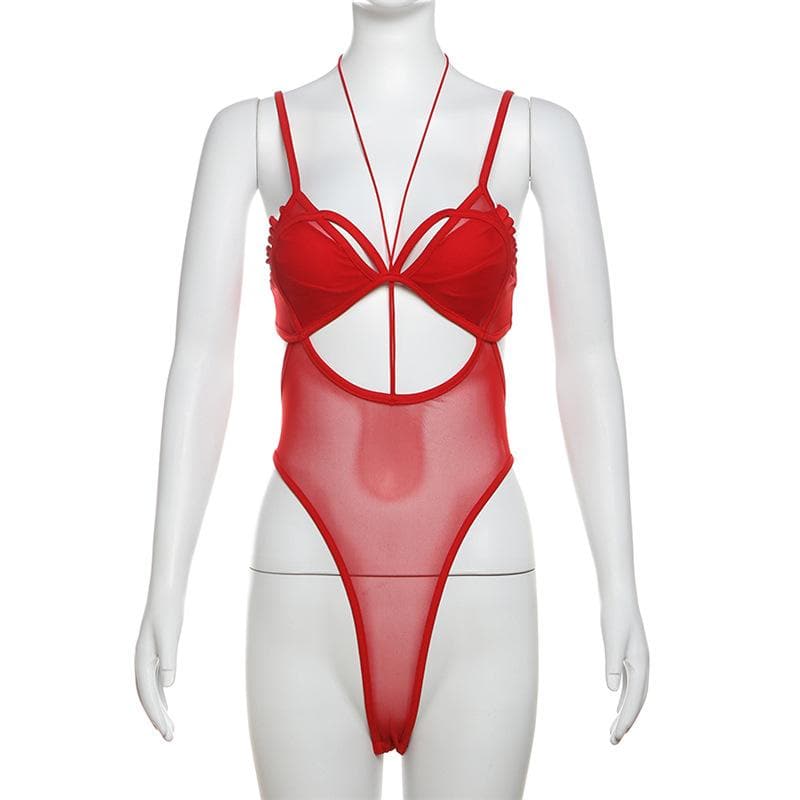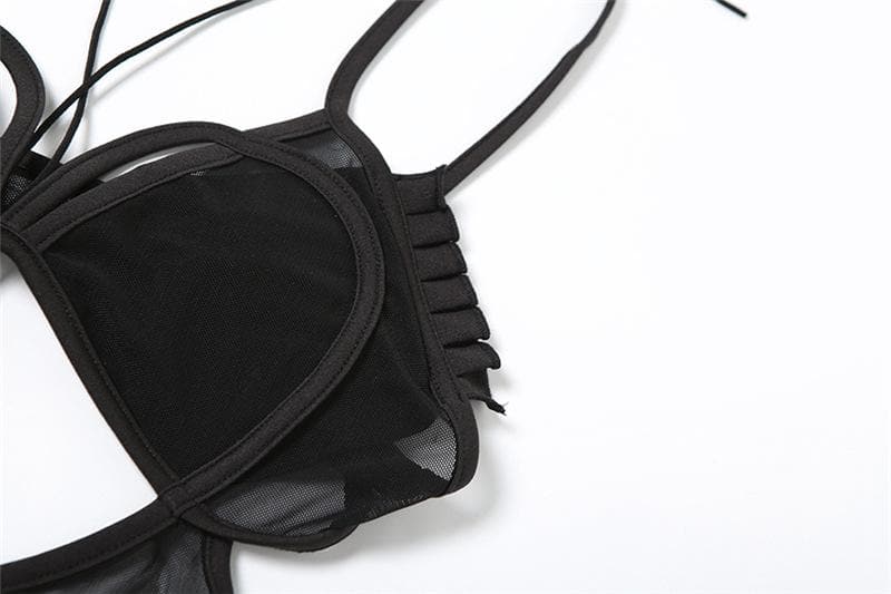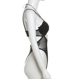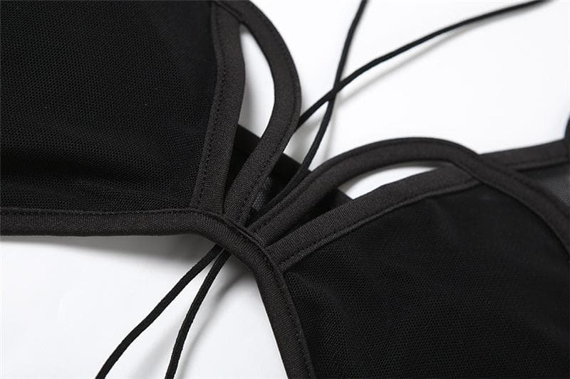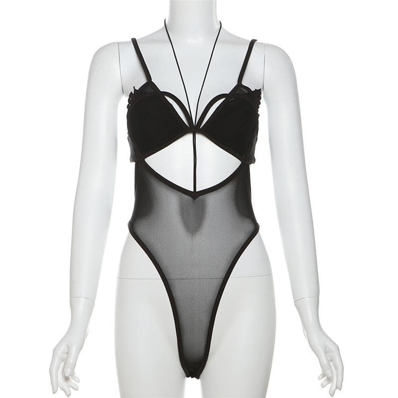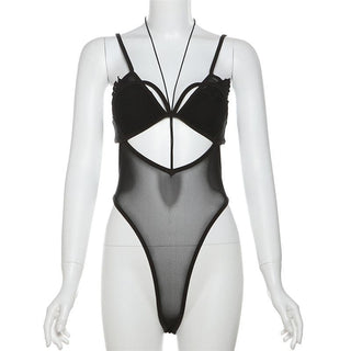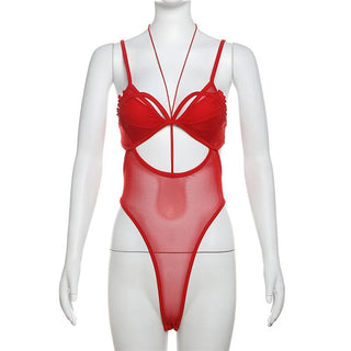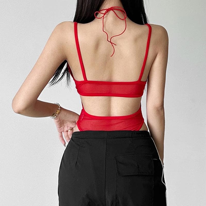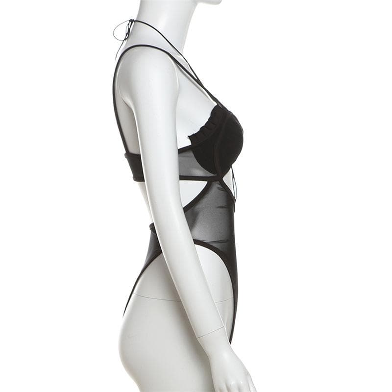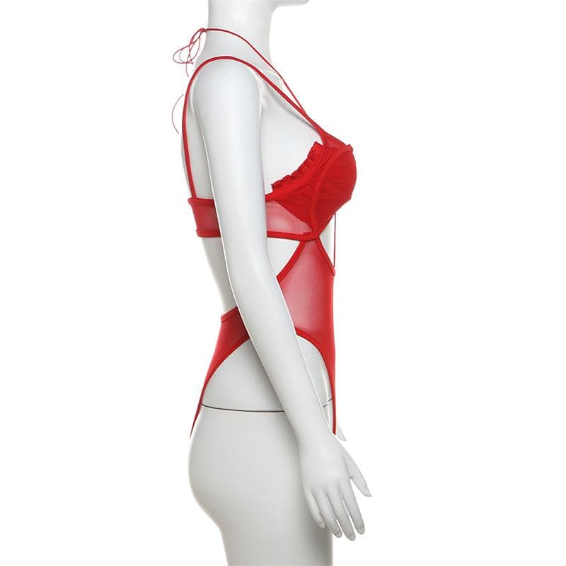 Mesh hollow out stitch ruffle solid cami bodysuit
