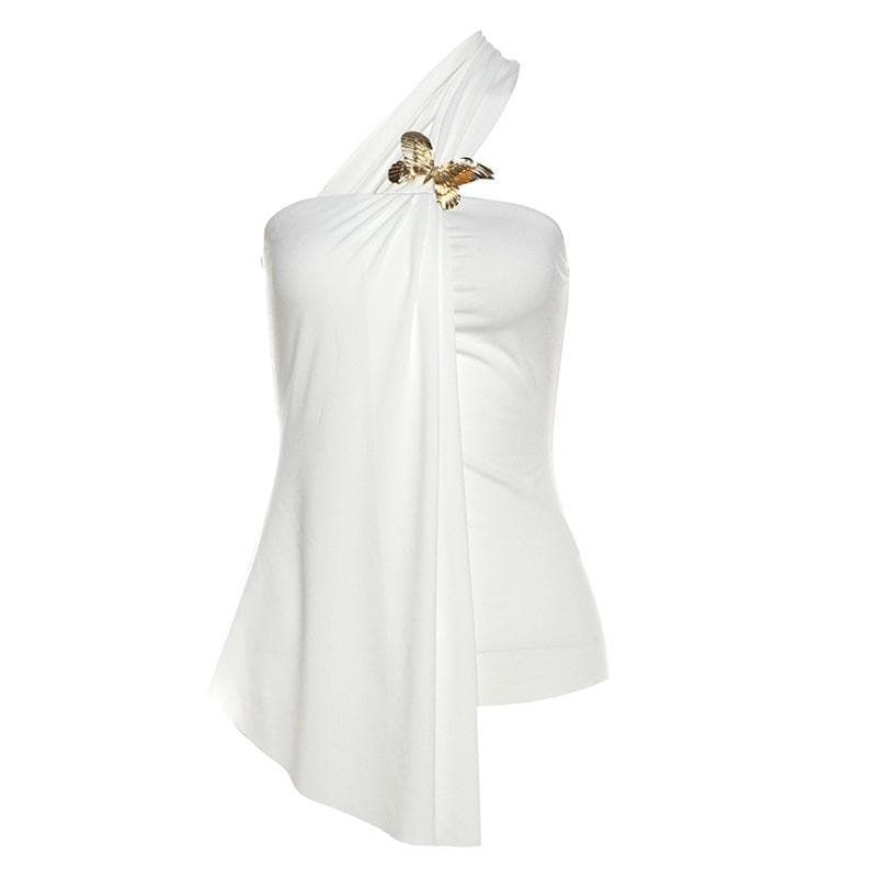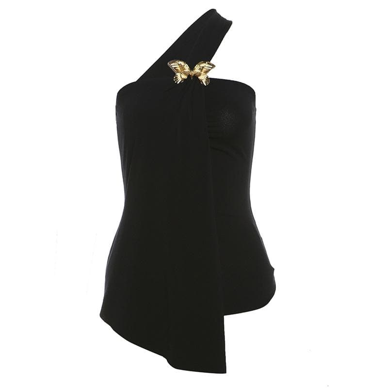 One shoulder chiffon butterfly applique irregular top