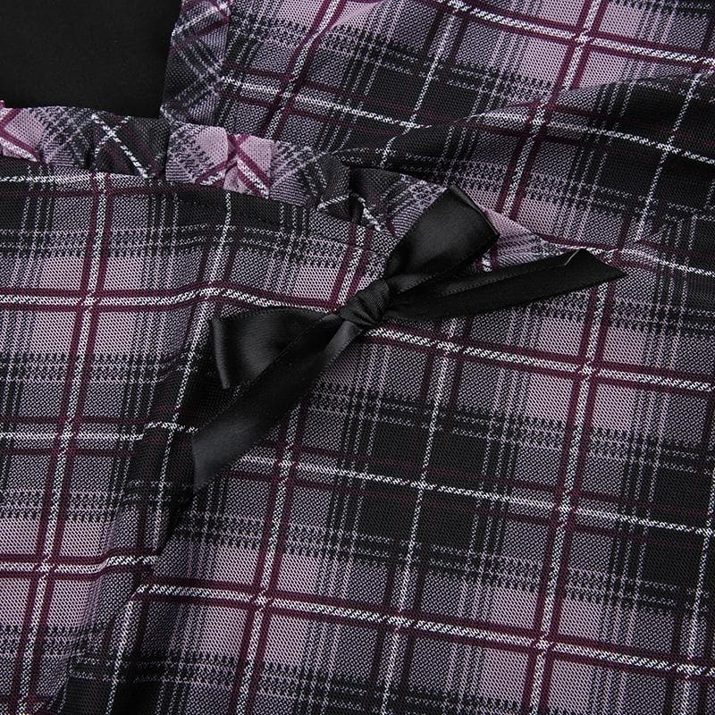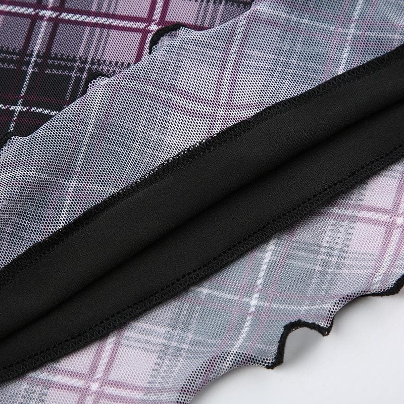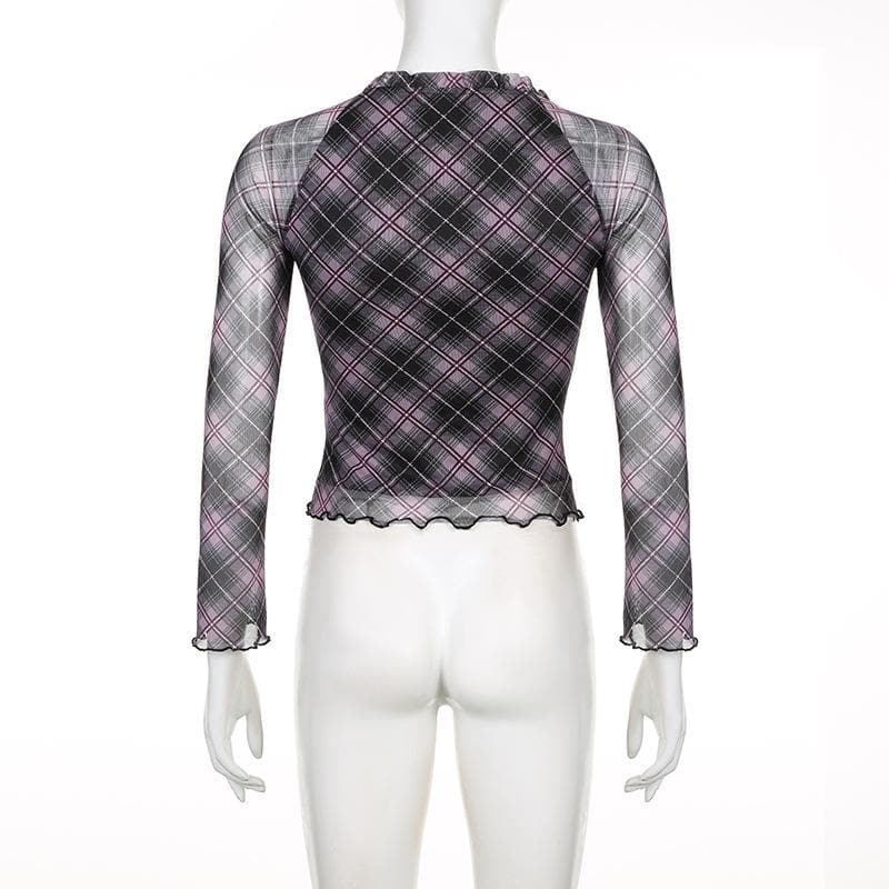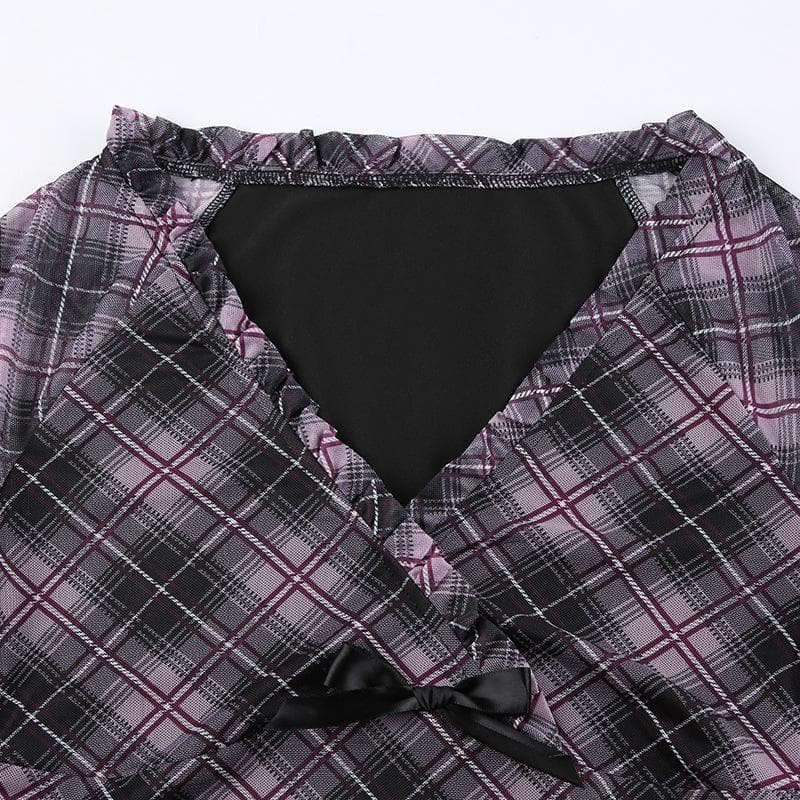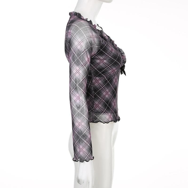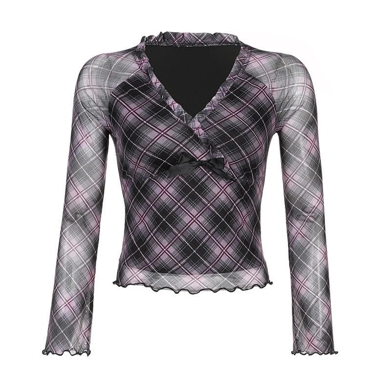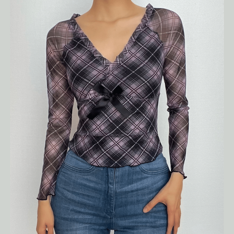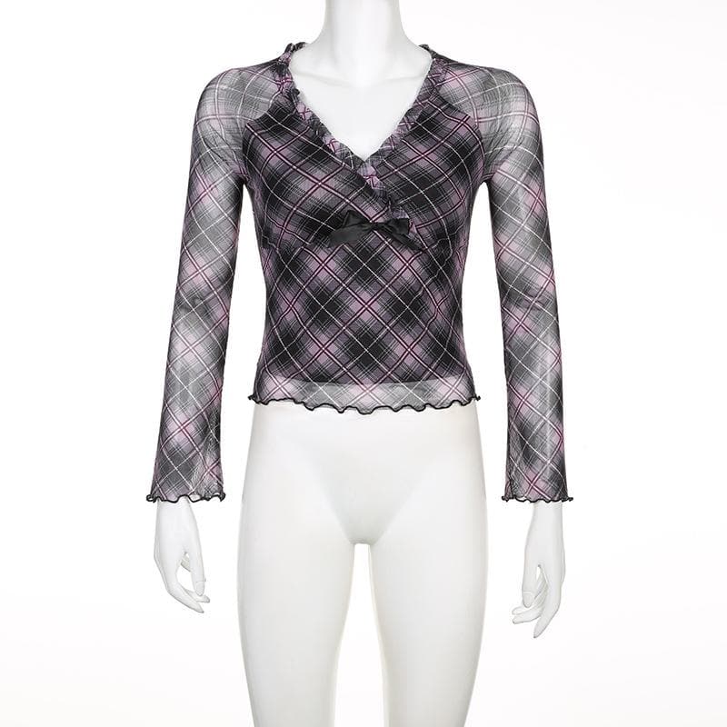Plaid ruffle v neck mesh contrast top