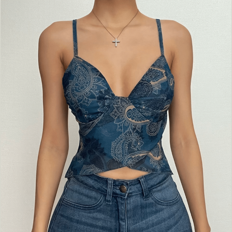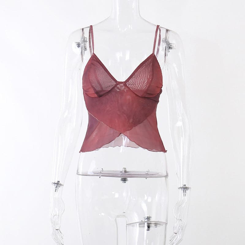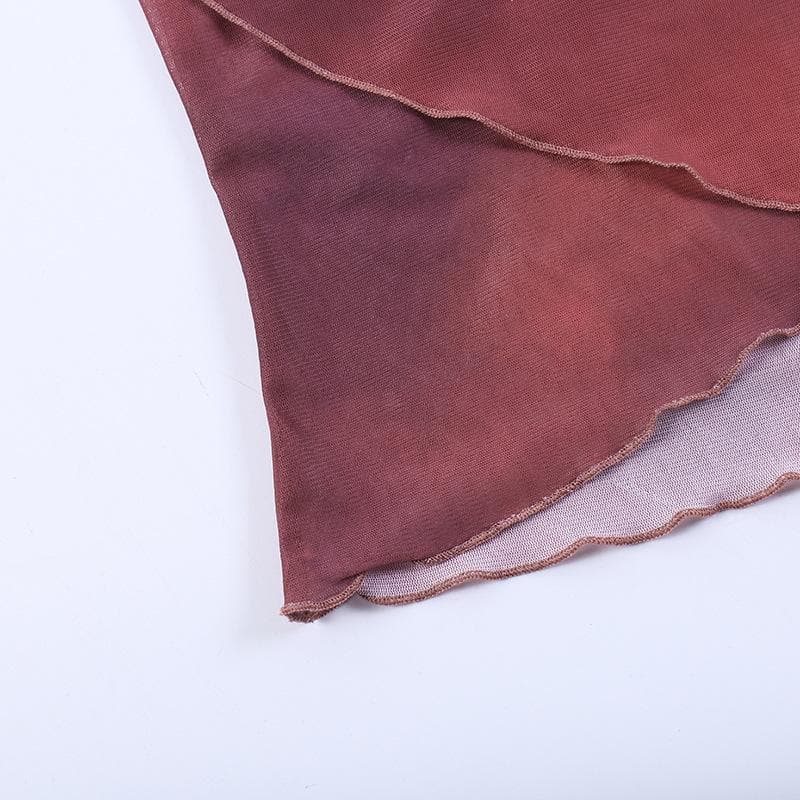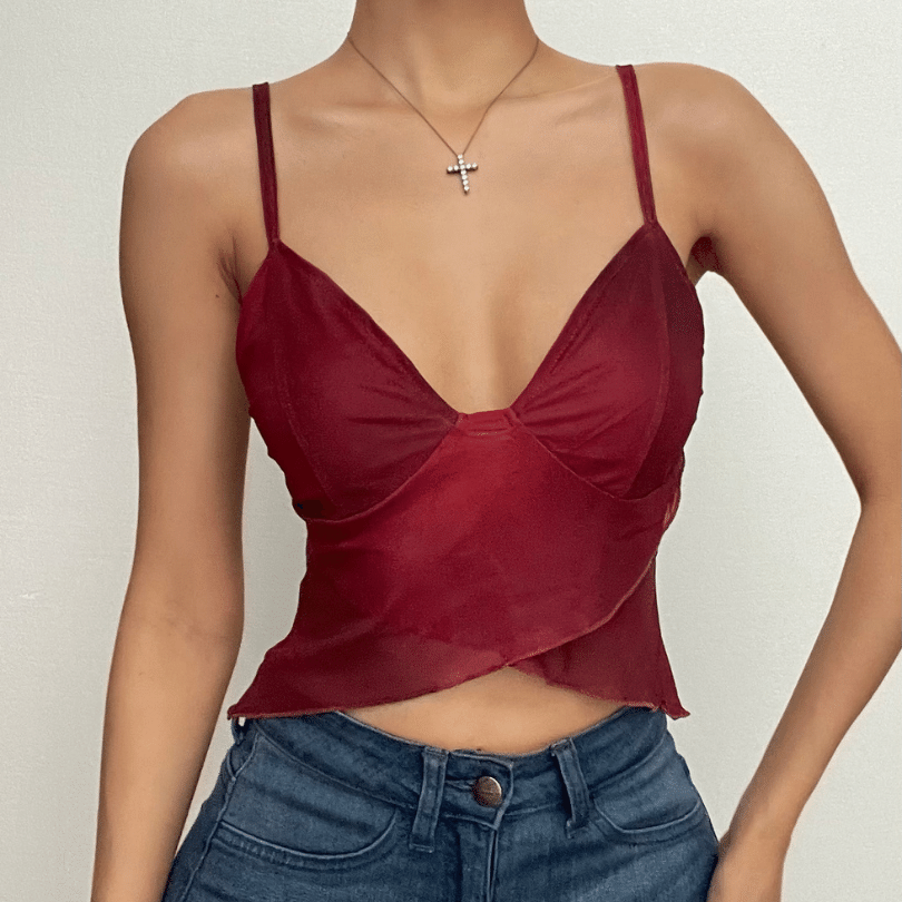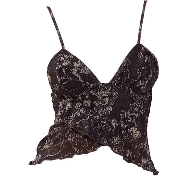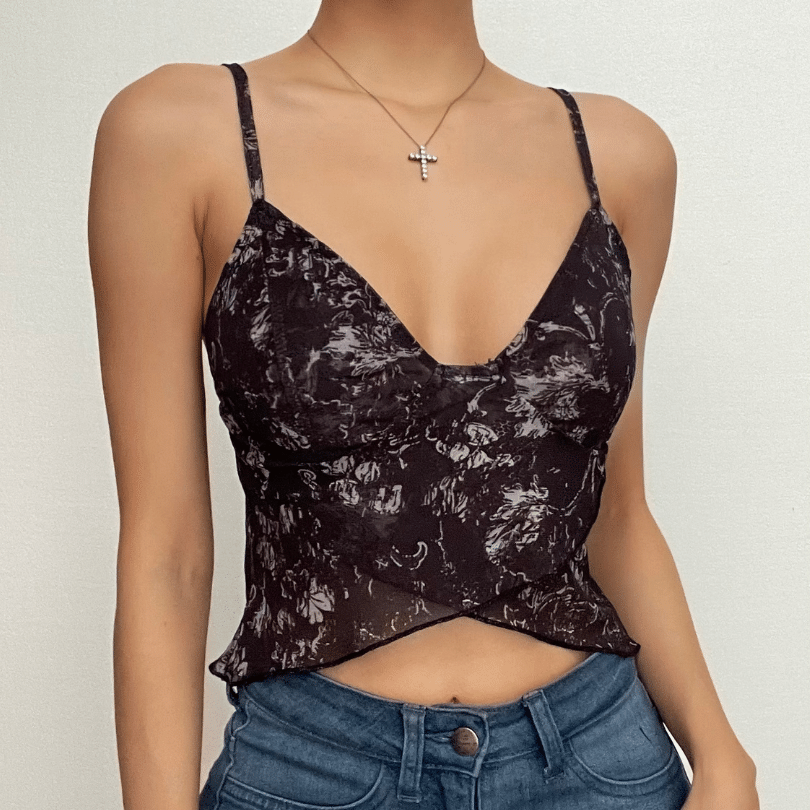 Ruffle v neck sheer mesh cross front print see through crop top