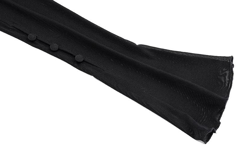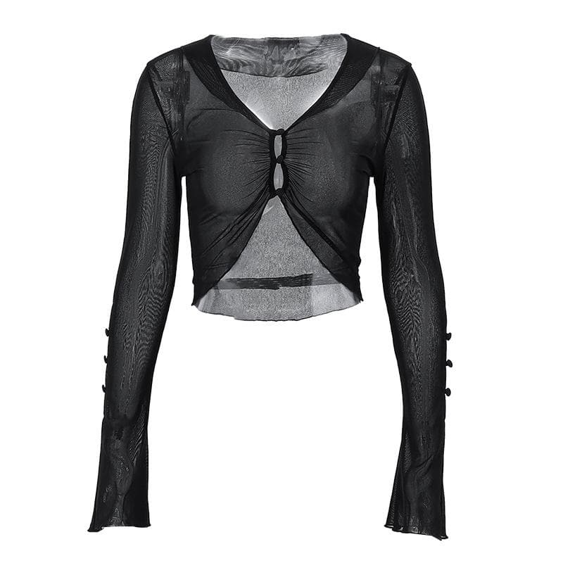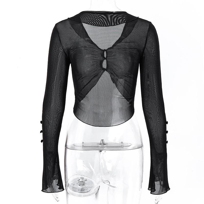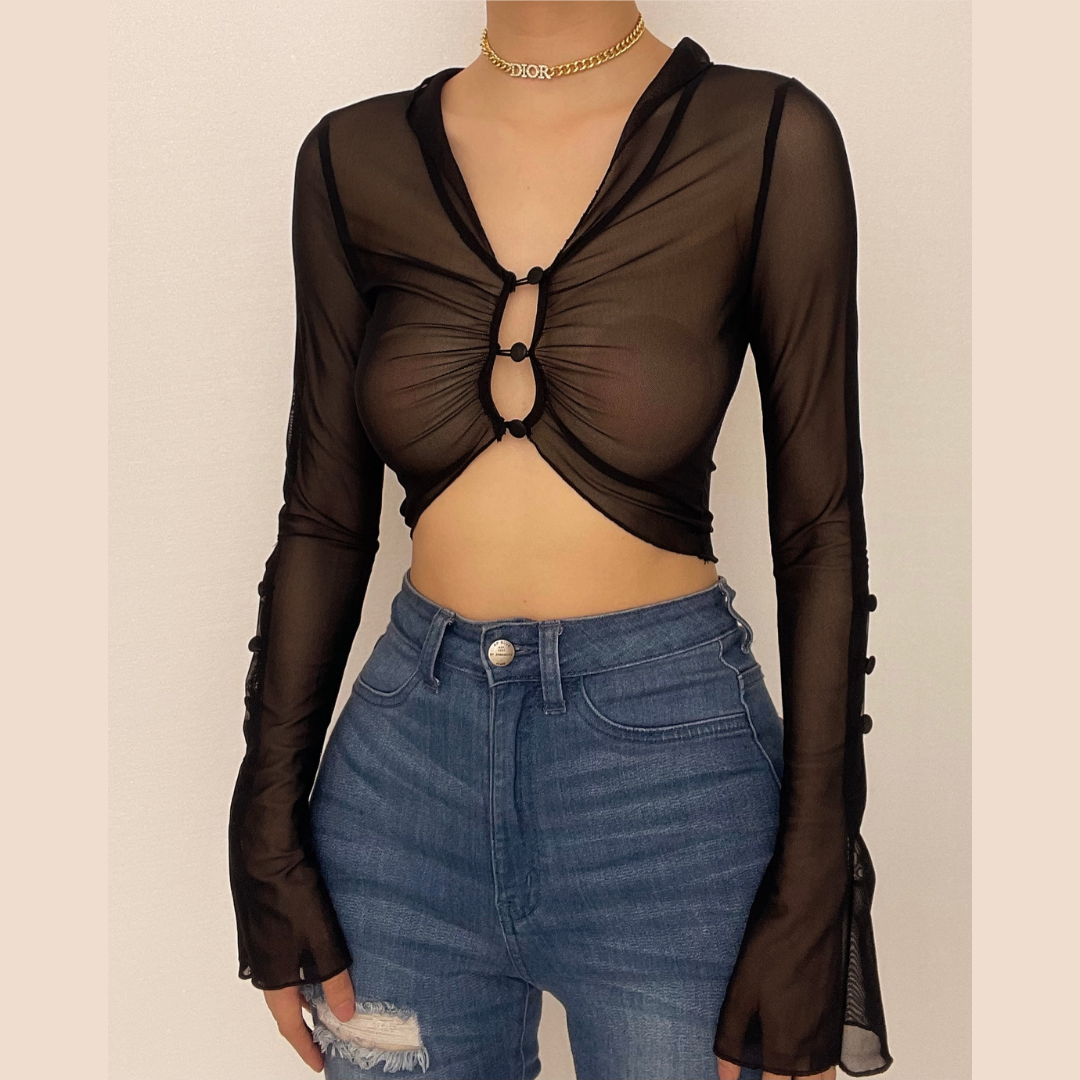 Sheer mesh see through button hollow out long sleeve crop cut out top