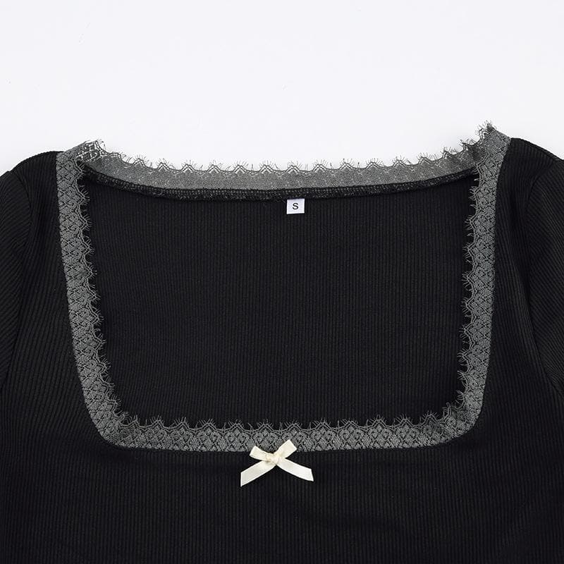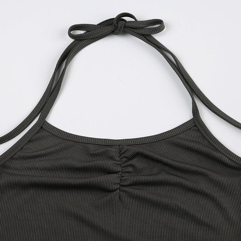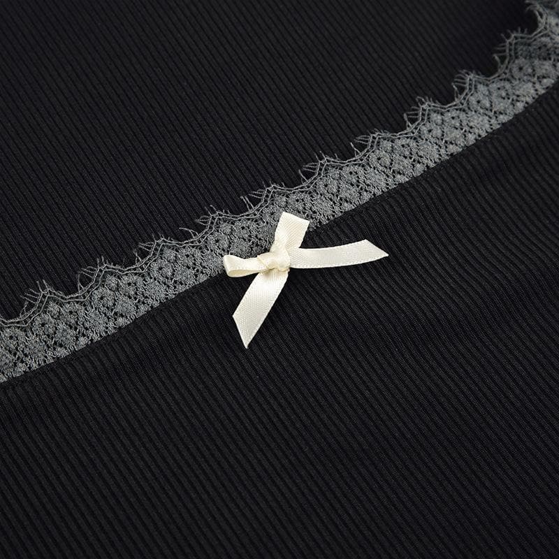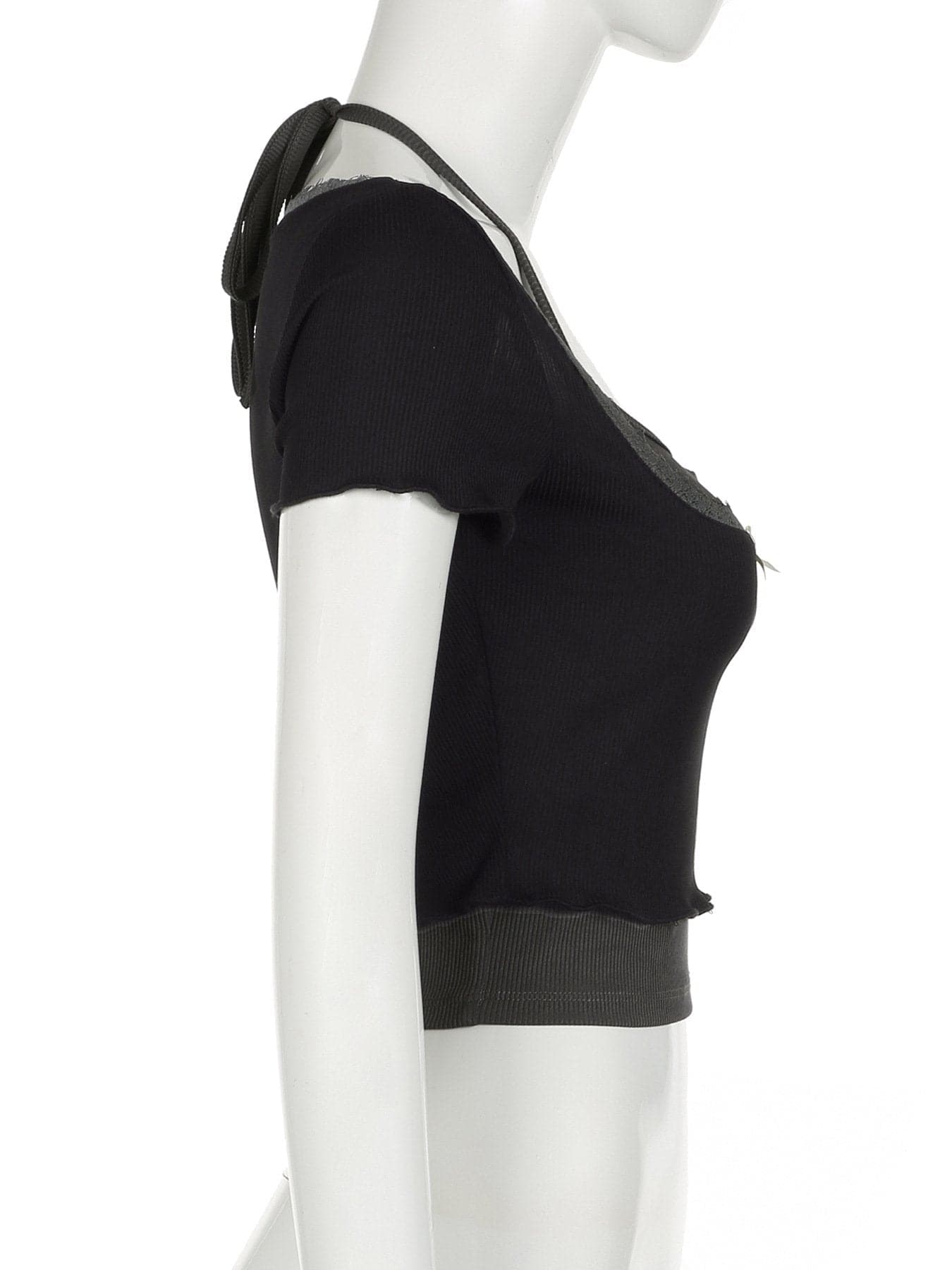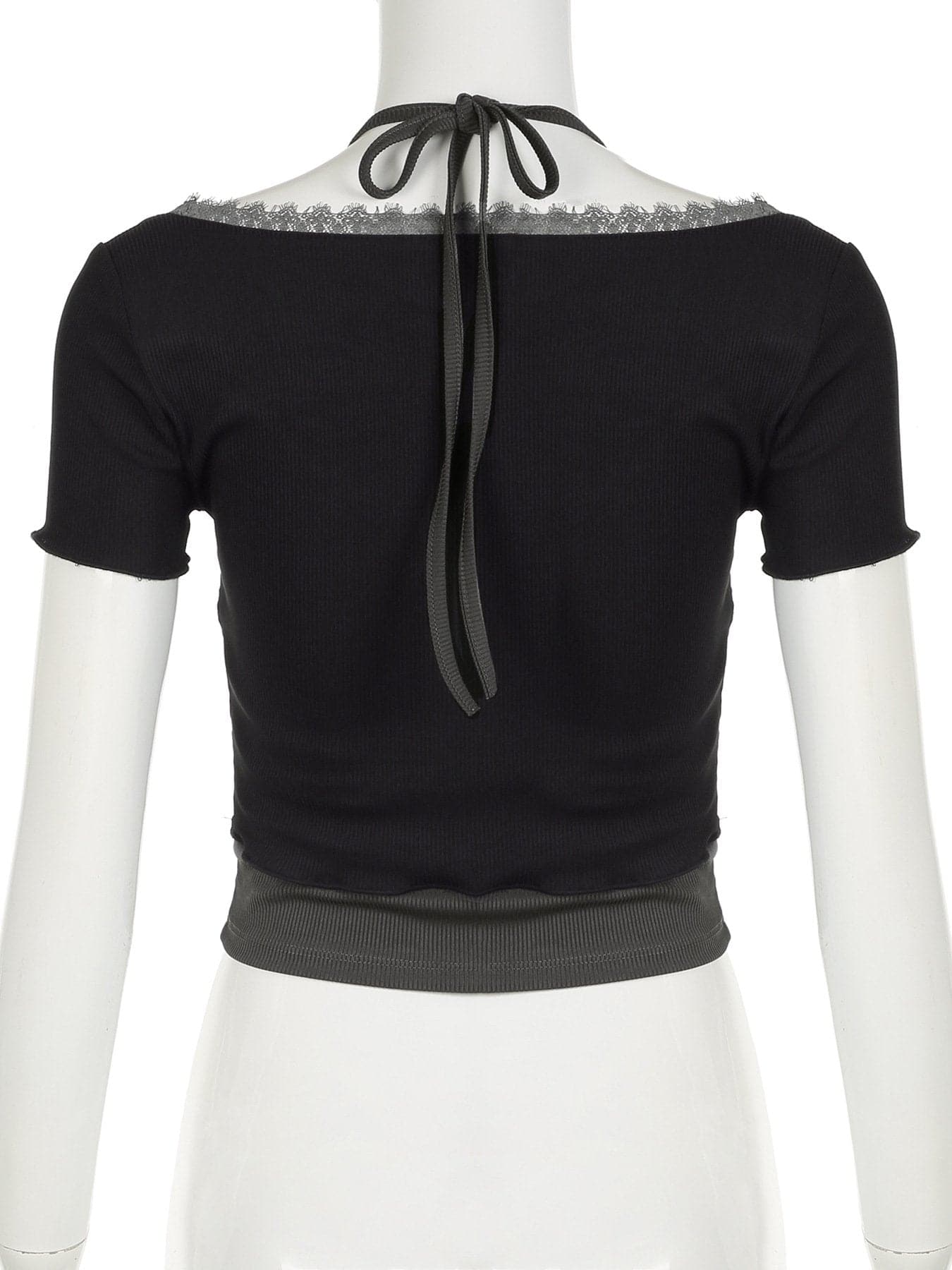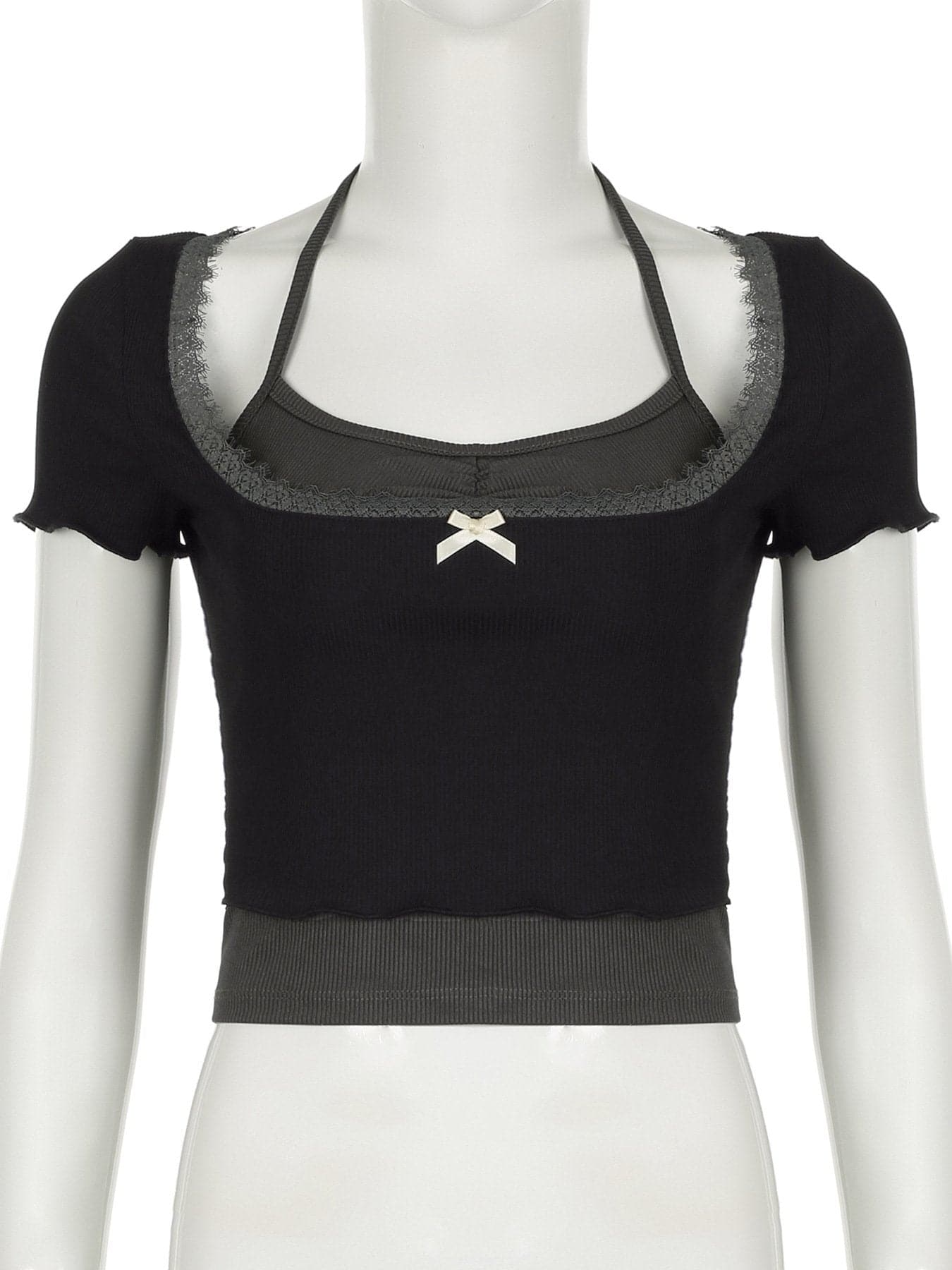 Short sleeve halter lace hem bowknot ribbed 2 piece top
