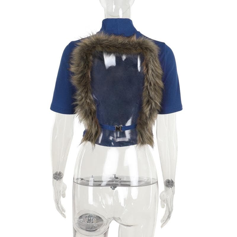 Short sleeve high neck fluffy backless top