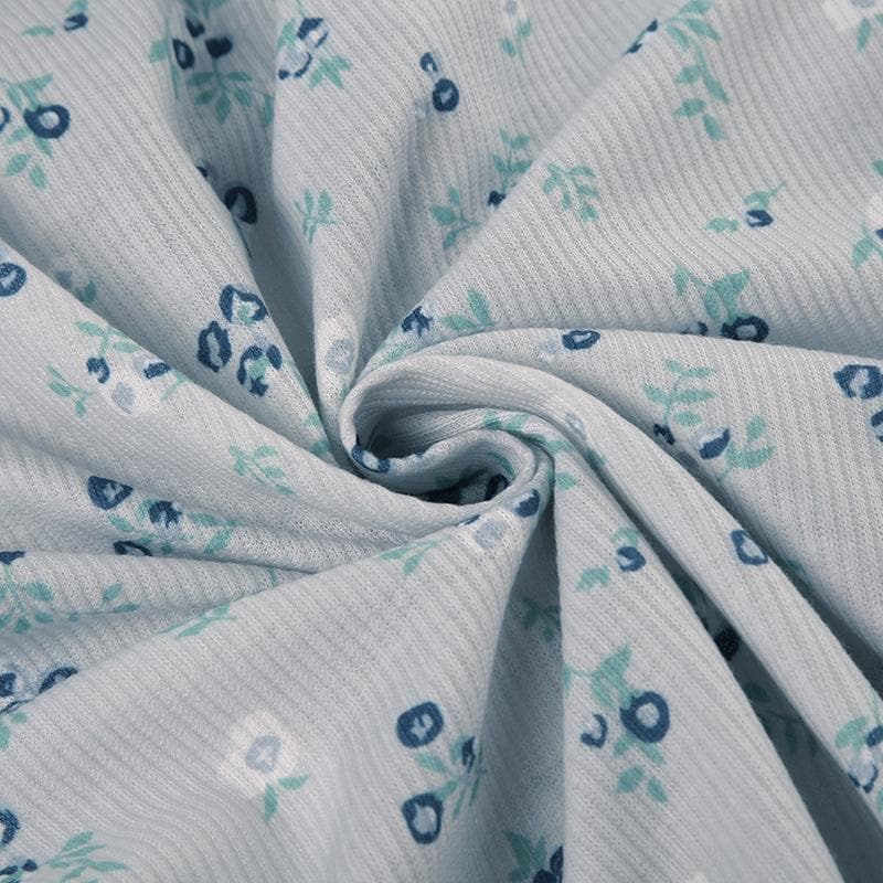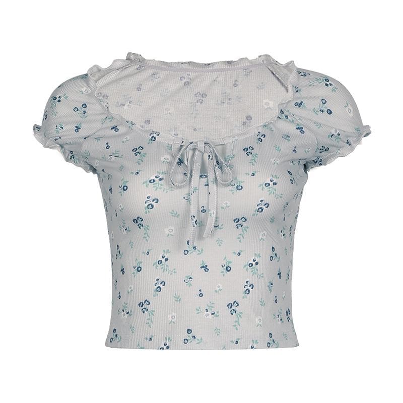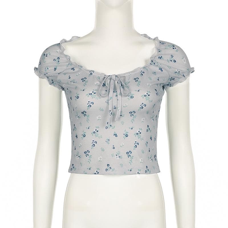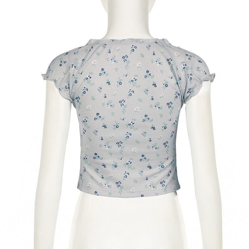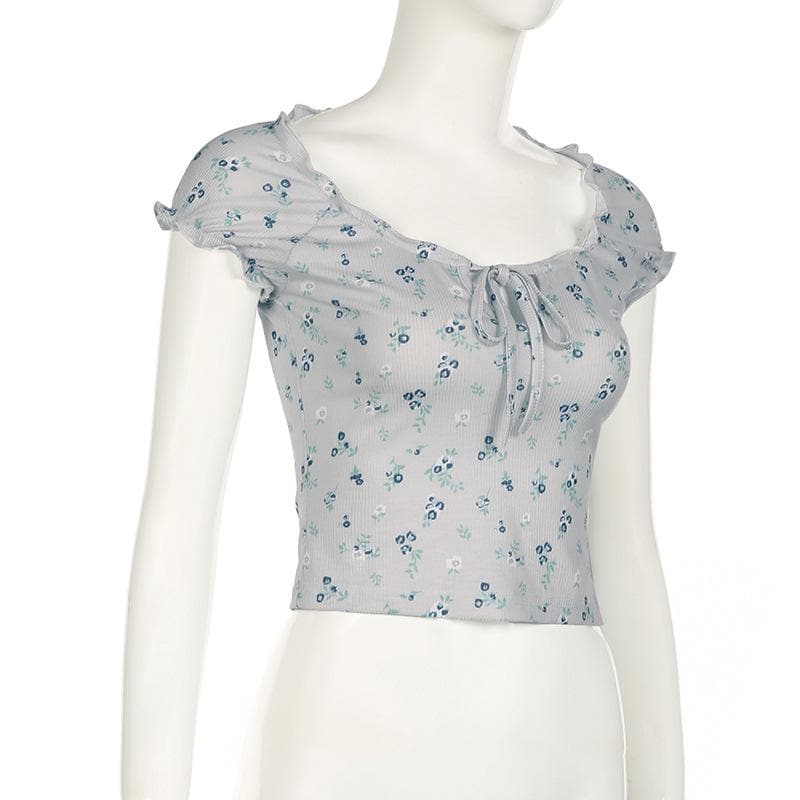 Short sleeve knotted ruffle ribbed print top