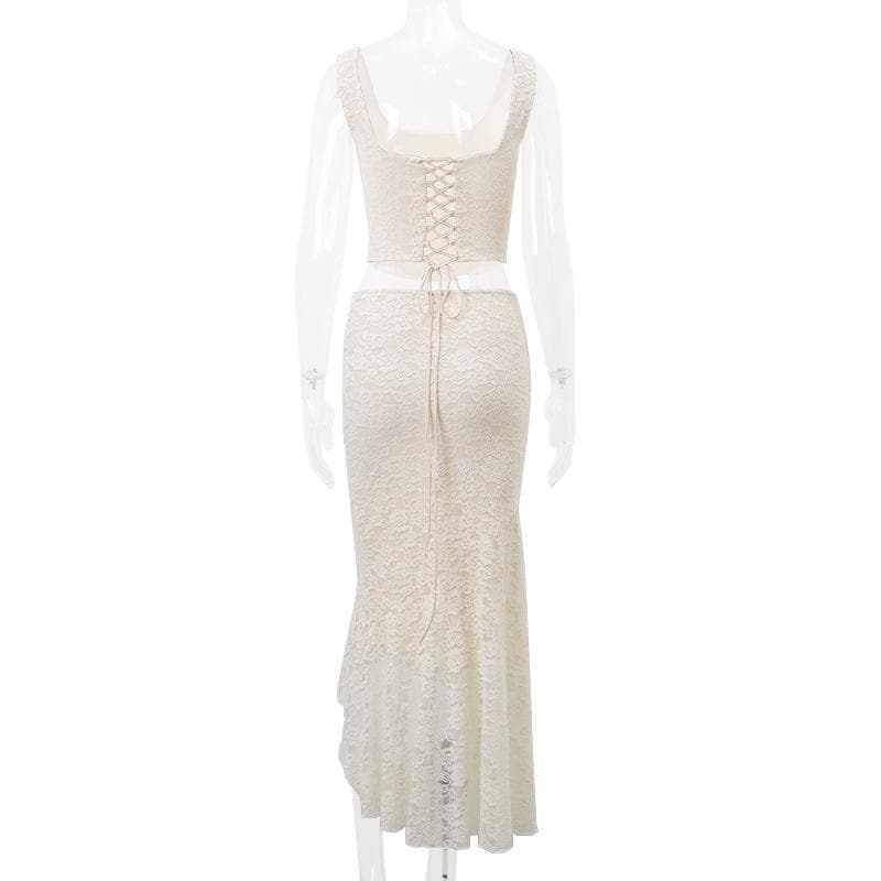 Sleeveless u neck backless lace up solid ruched midi skirt set