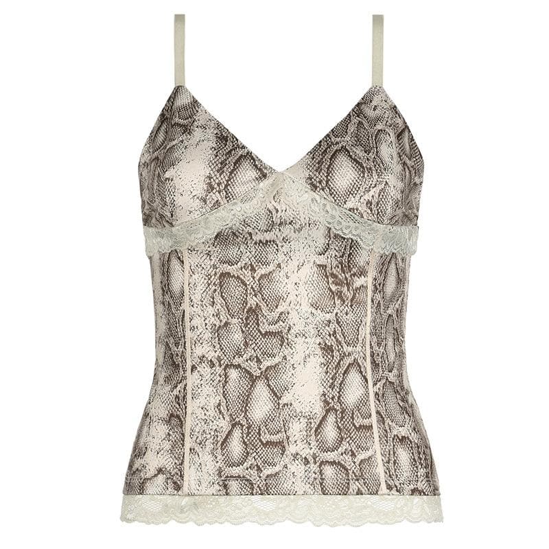 Snake print v neck lace hem cami top