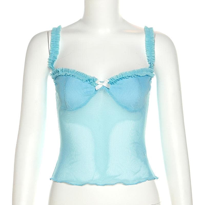 Sweetheart neck mesh bowknot backless ruffle lace hem cami top