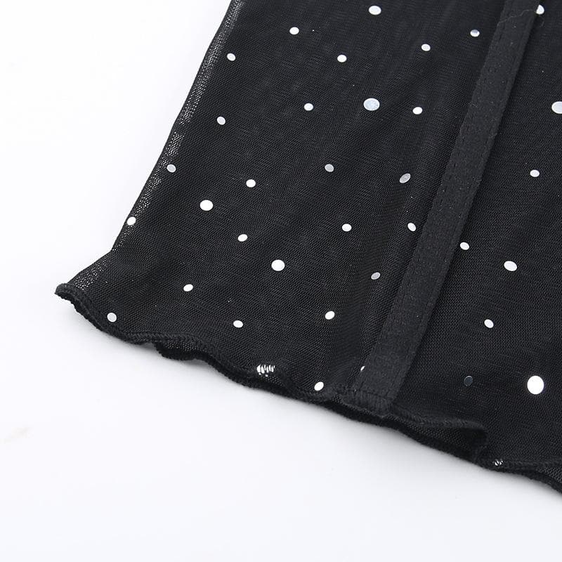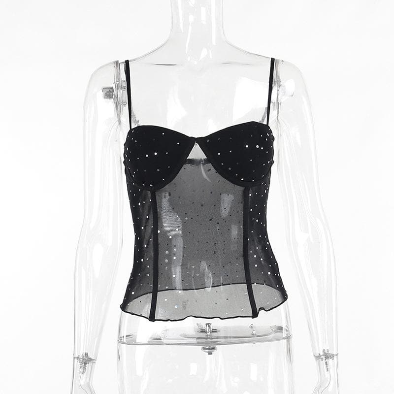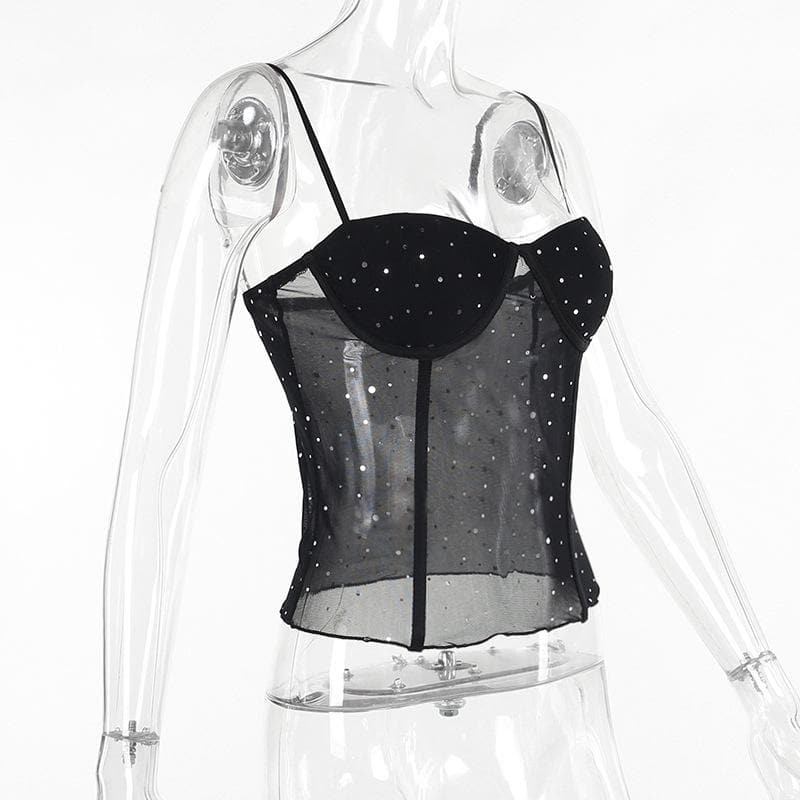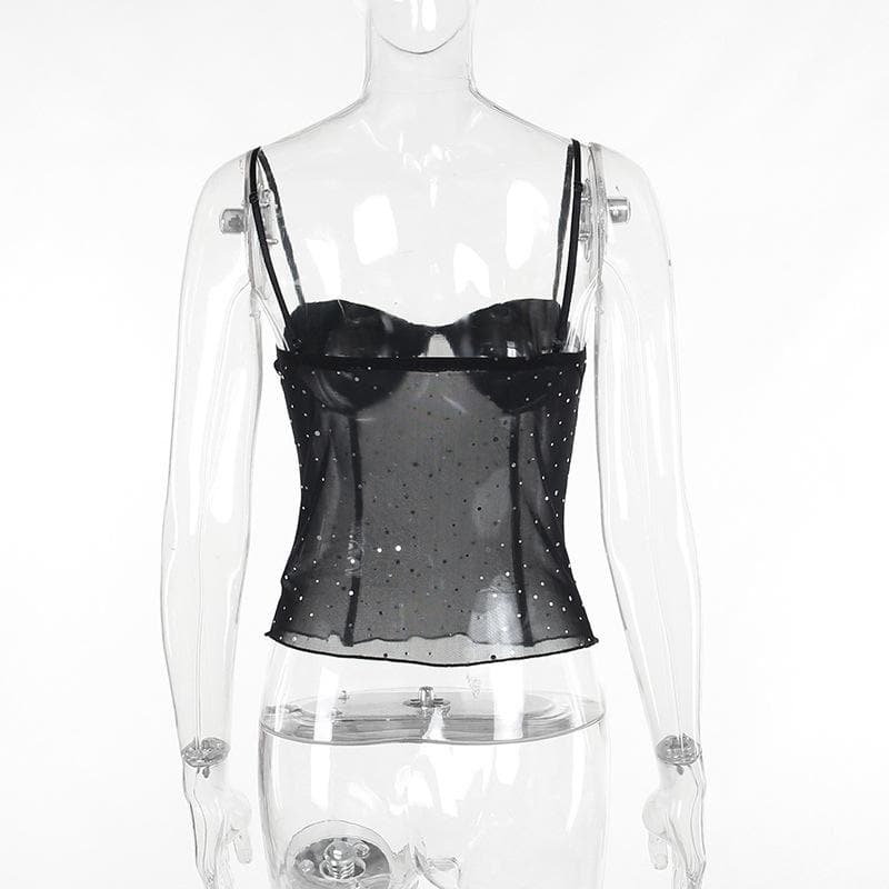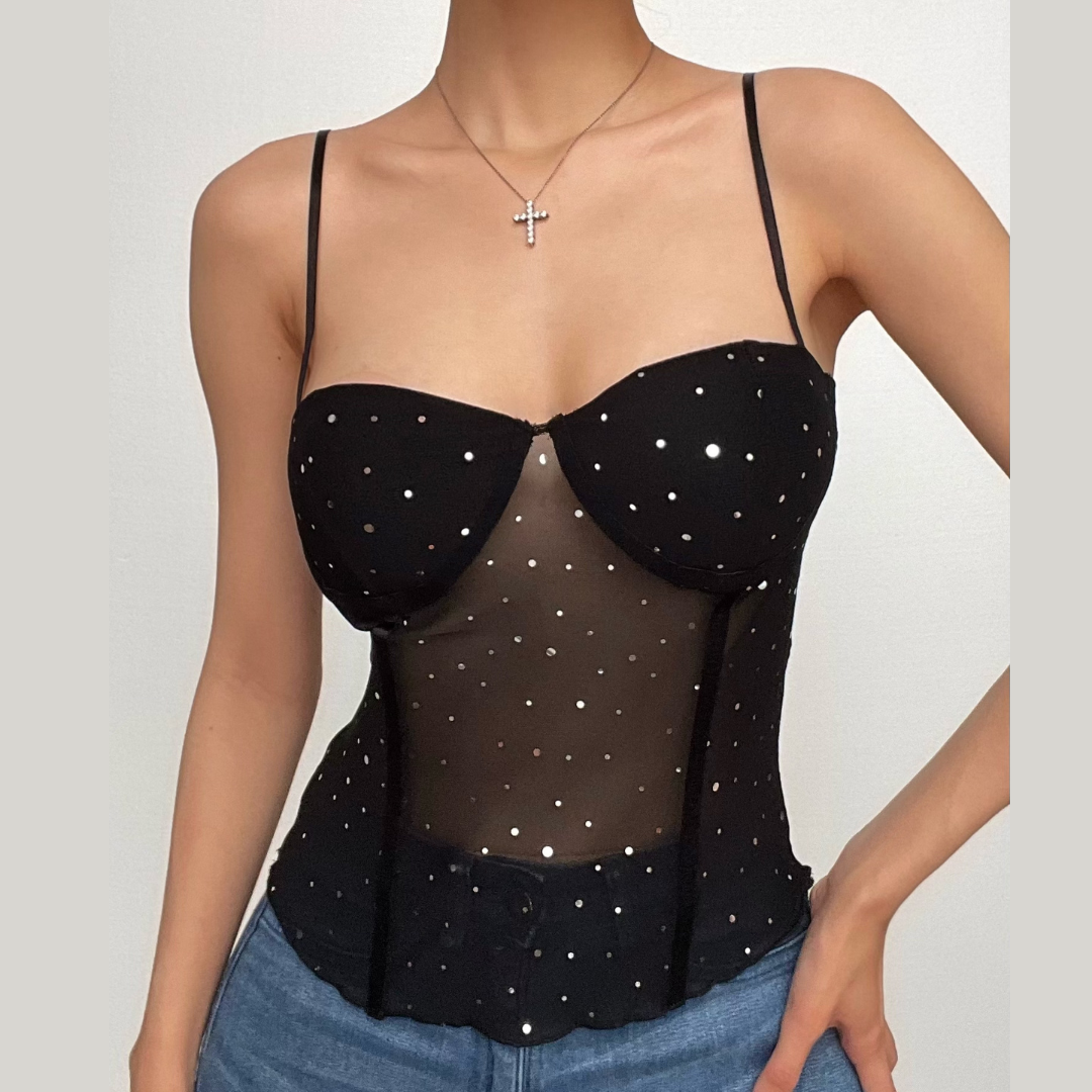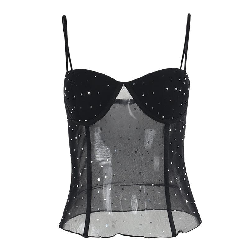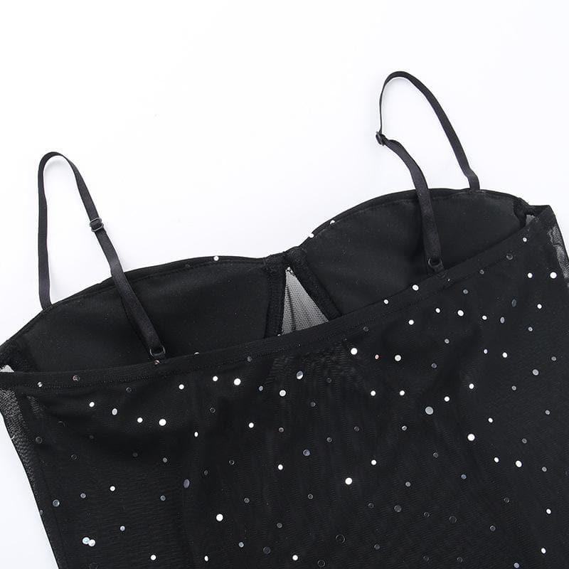 Sweetheart neck ruffle glitter backless stitch mesh cami top