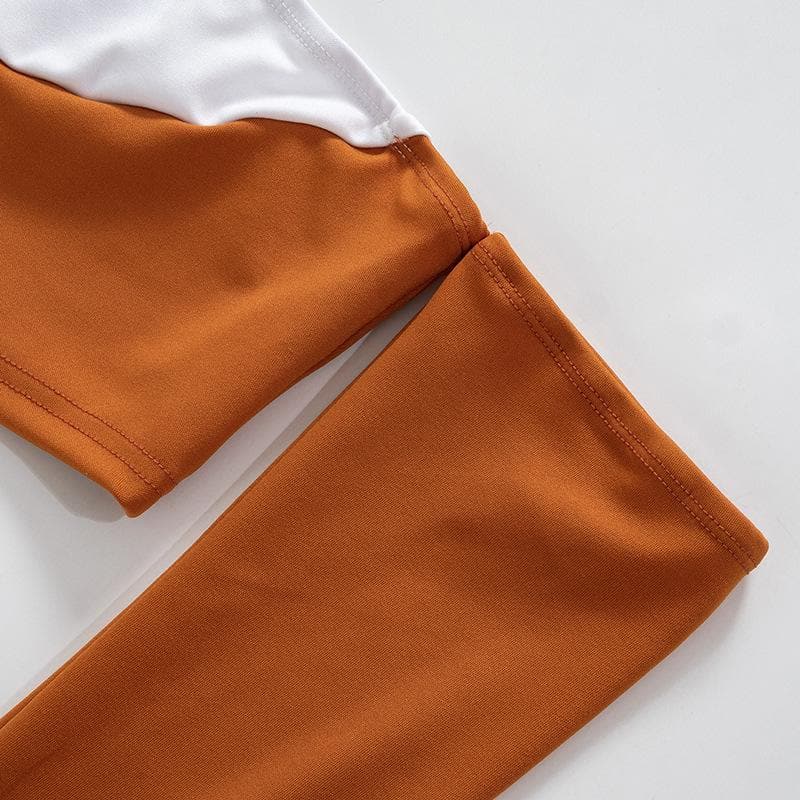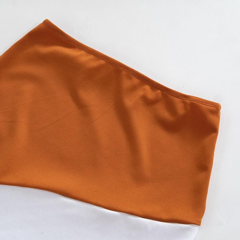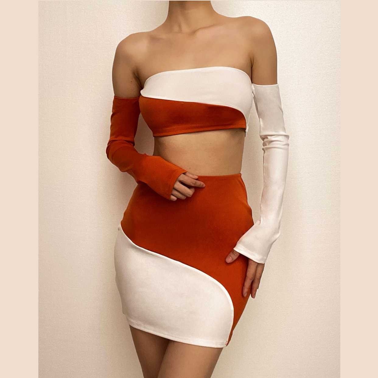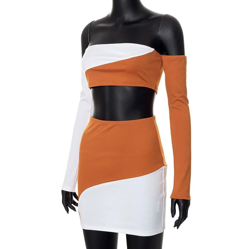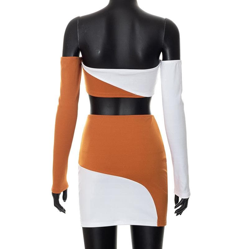 Contrast patchwork off shoulder long sleeve backless mini skirt set