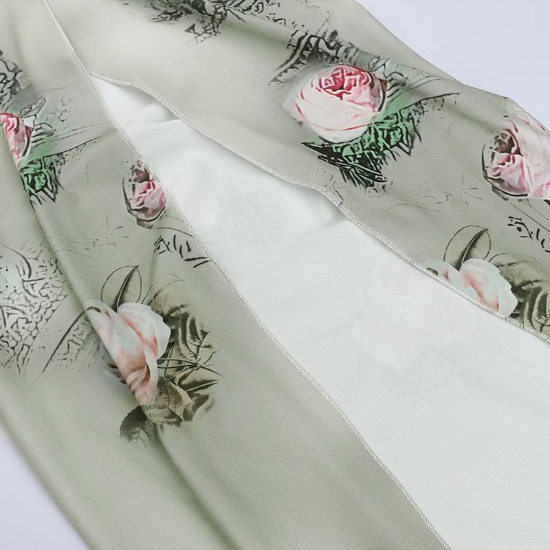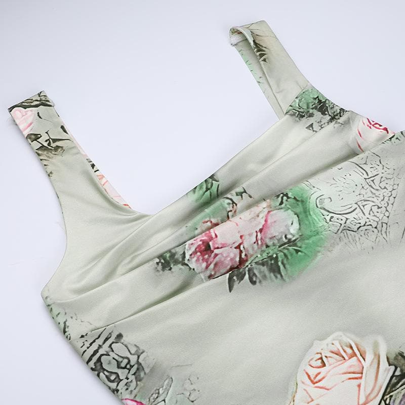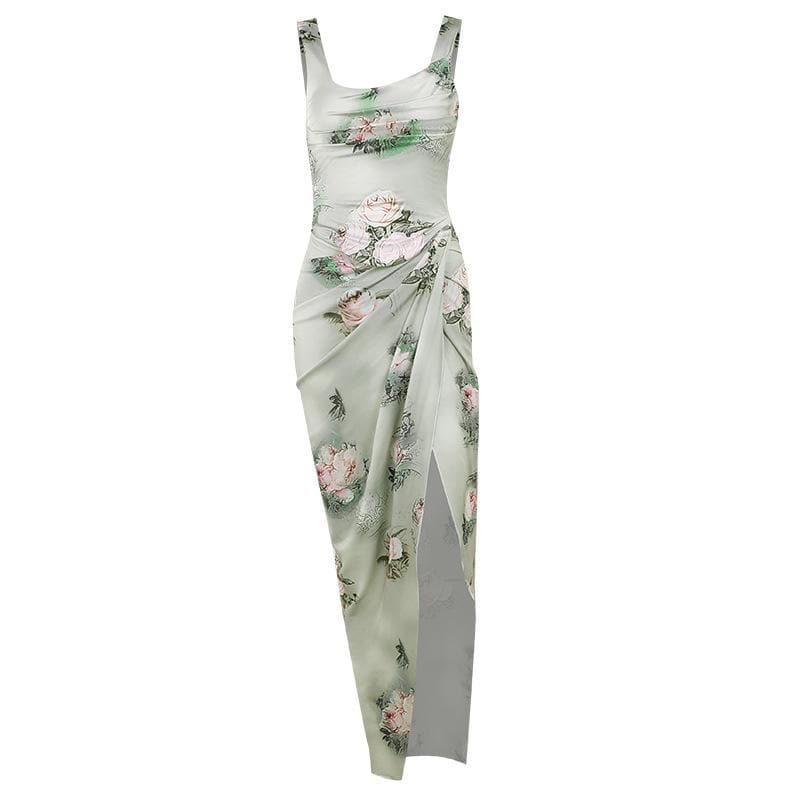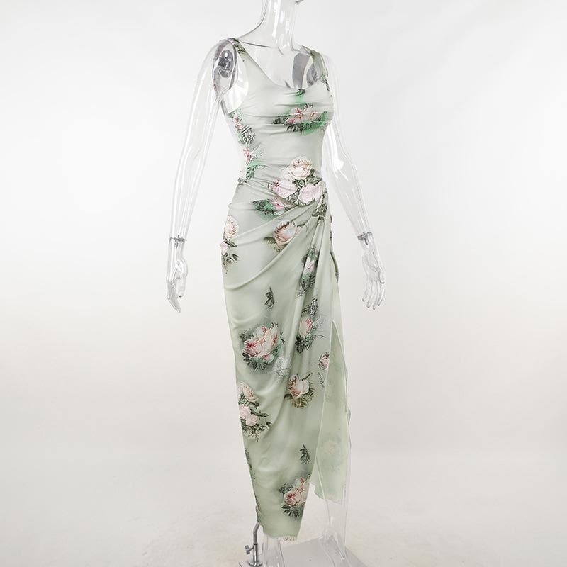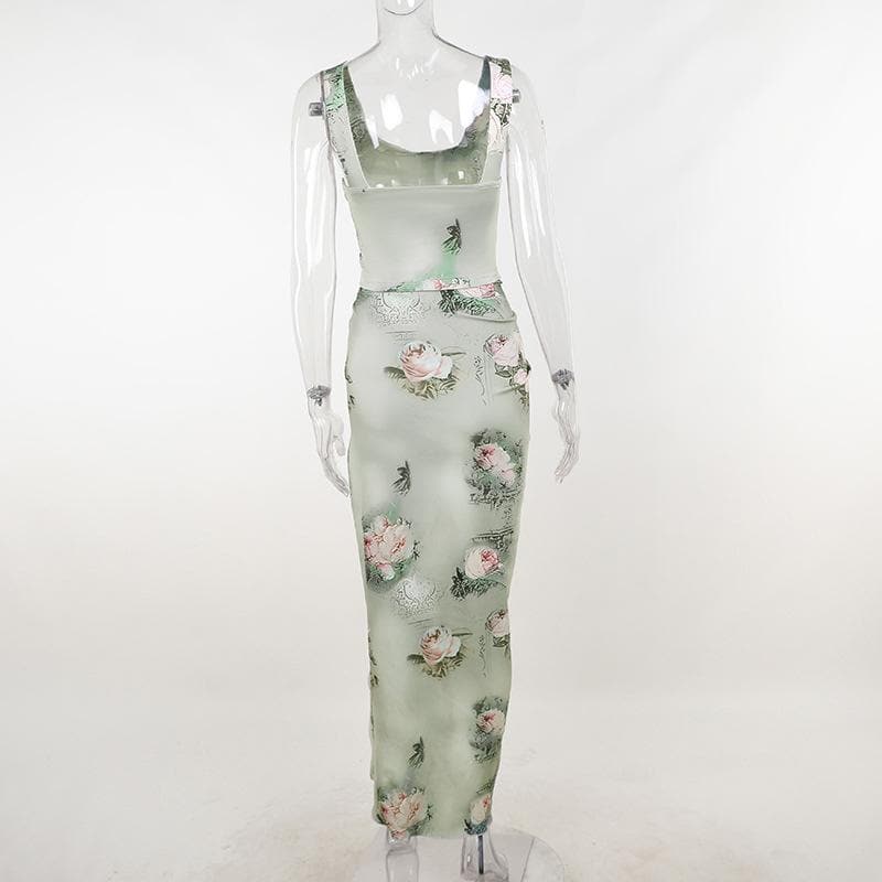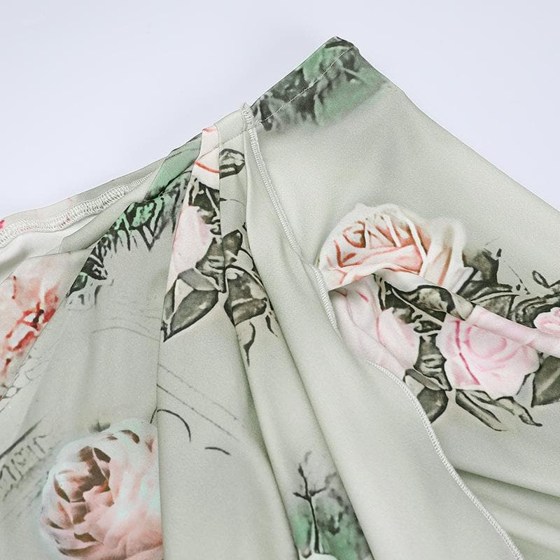 Flower print cowl neck contrast slit ruched sleeveless maxi skirt set