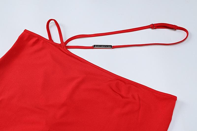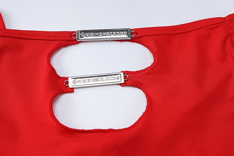 Hollow out metal tag halter self tie backless slit maxi skirt set