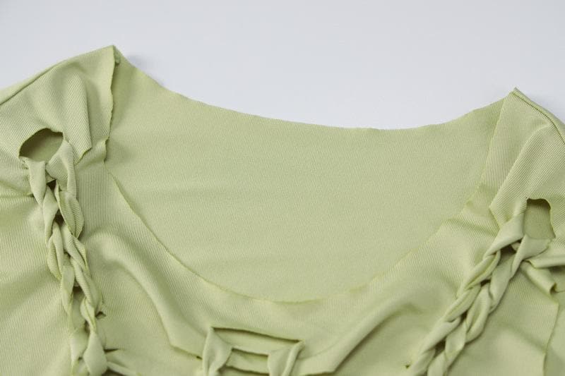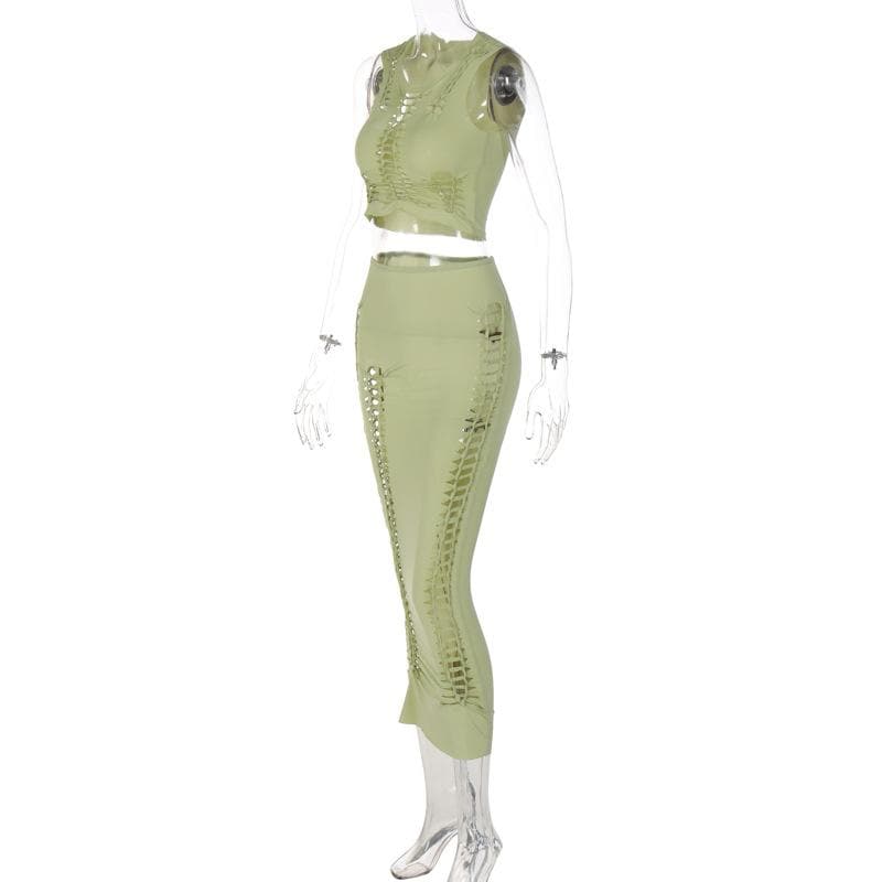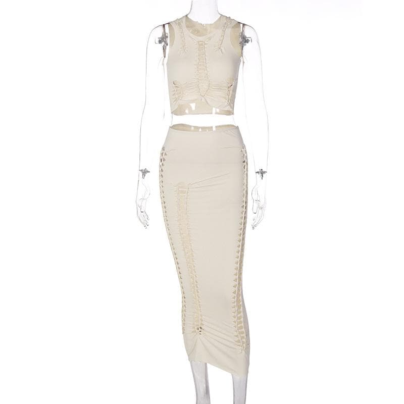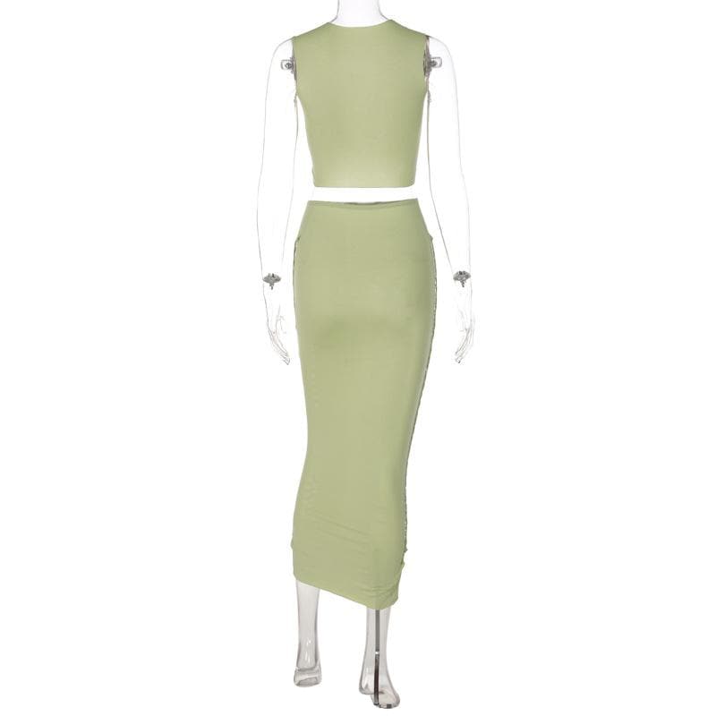Hollow out ruched solid sleeveless cut out midi skirt set