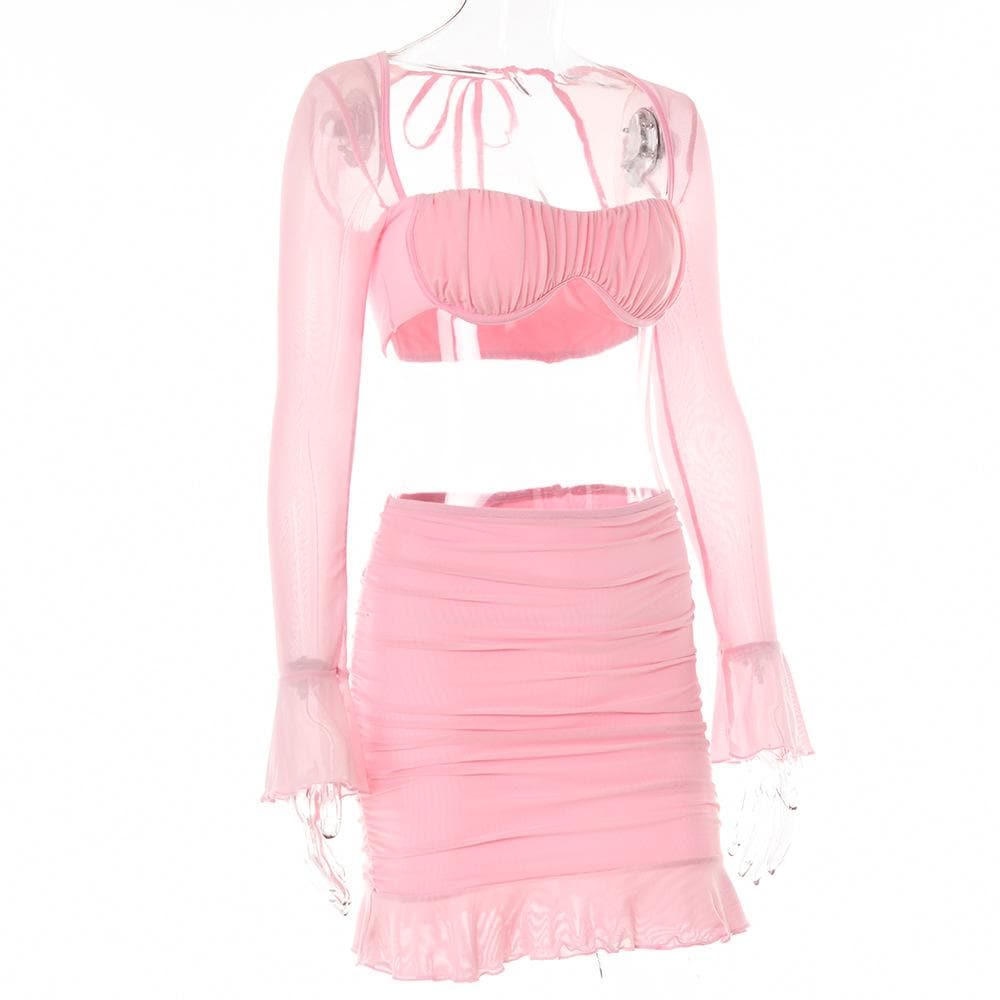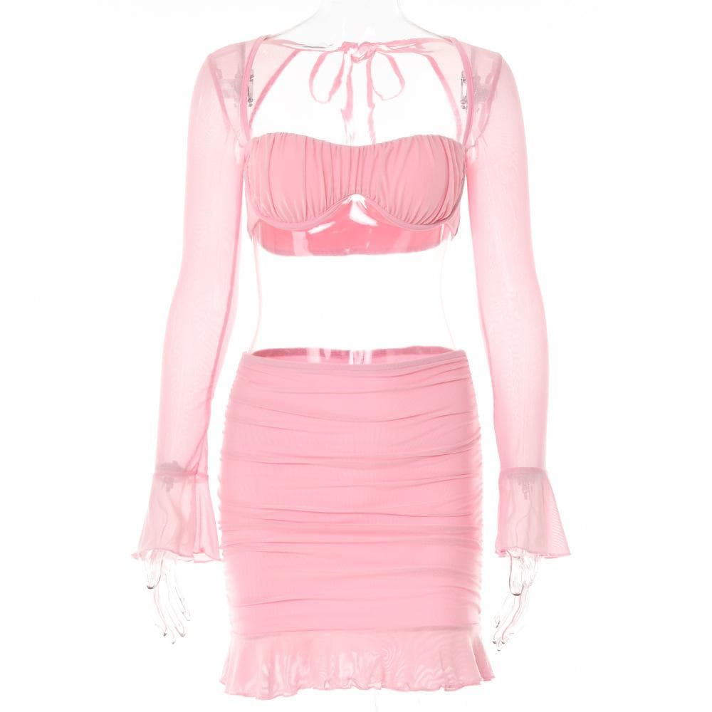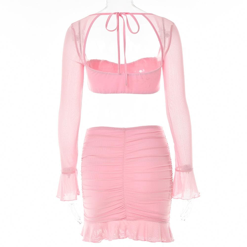 Mesh hollow out solid ruffle long sleeve ruched mini skirt set