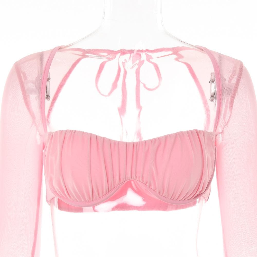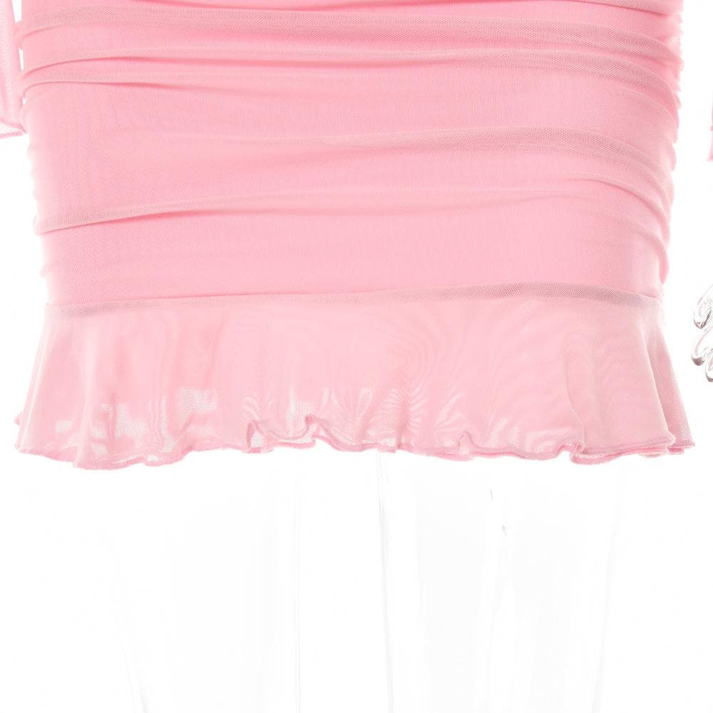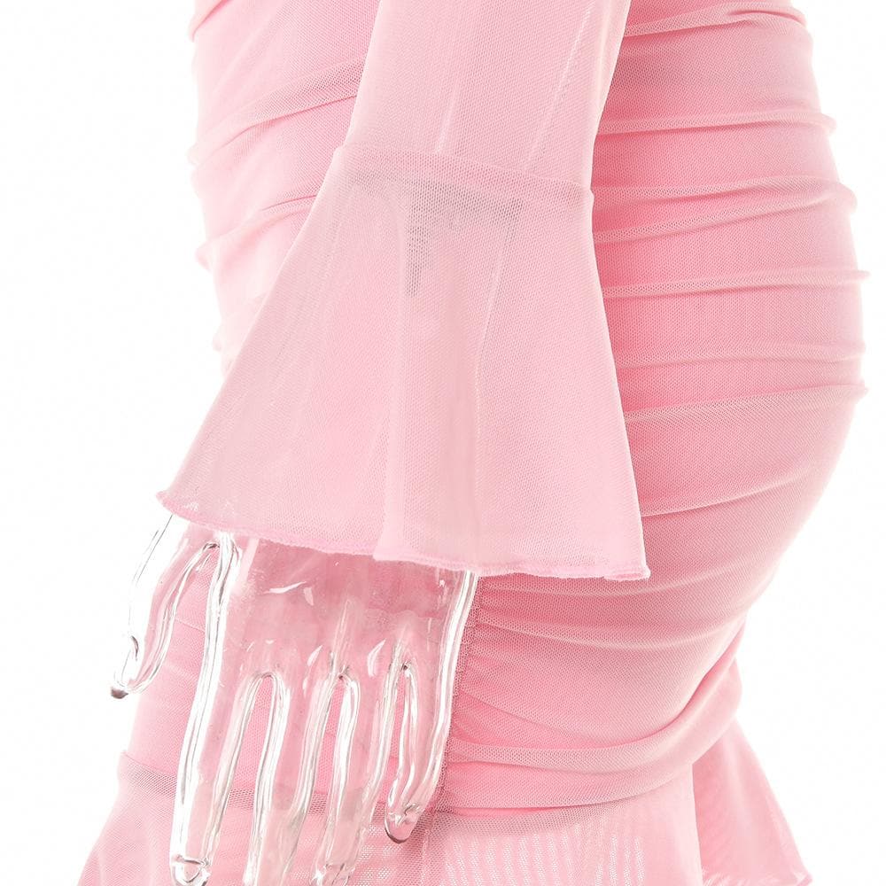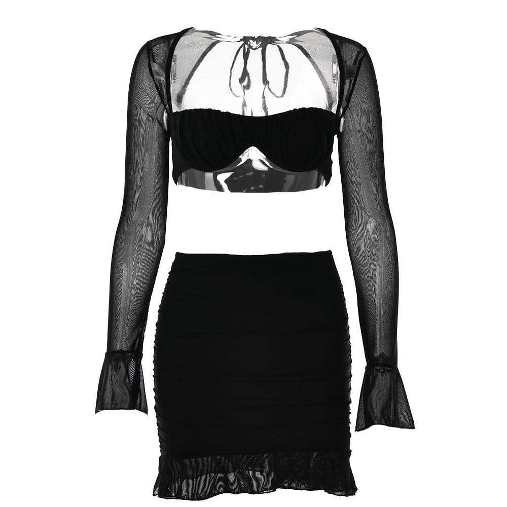 Mesh hollow out solid ruffle long sleeve ruched mini skirt set