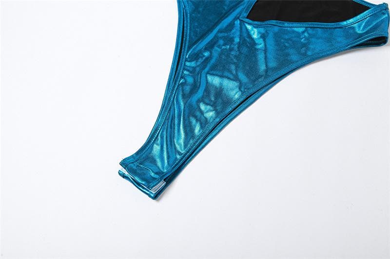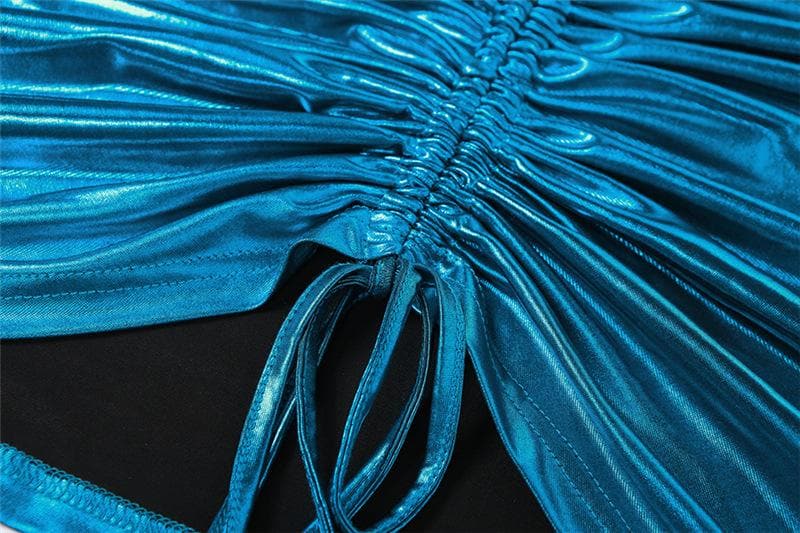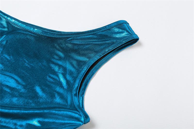 Metallic one shoulder hollow out irregular drawstring bodysuit mini skirt set