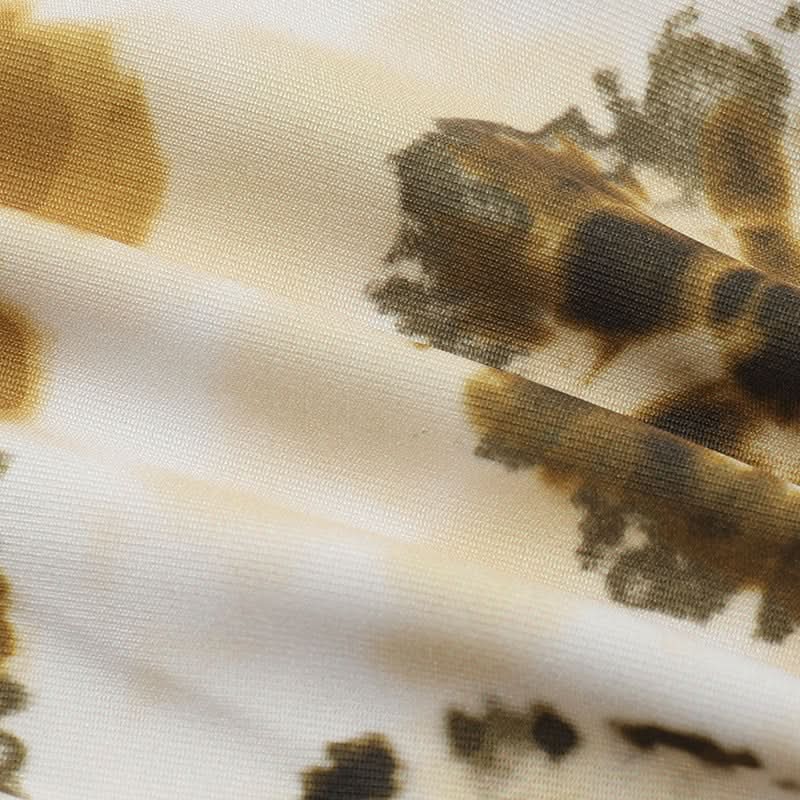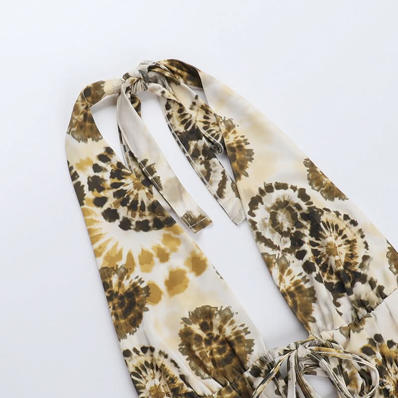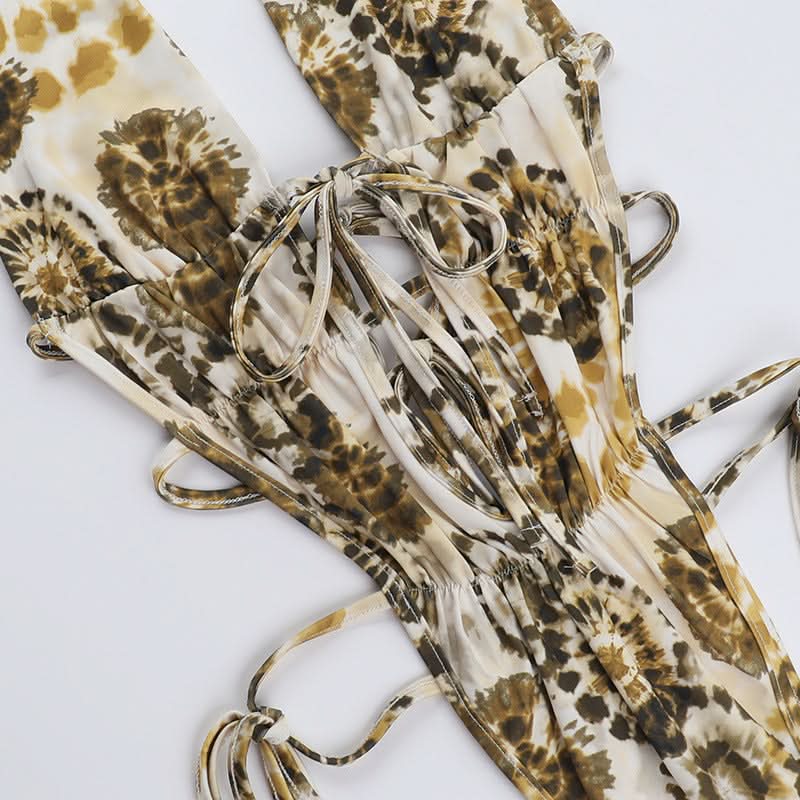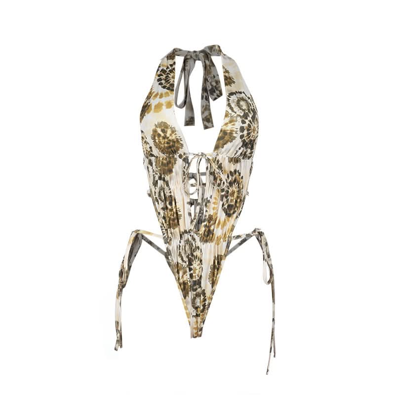 Halter self tie ruched print hollow out bodysuit