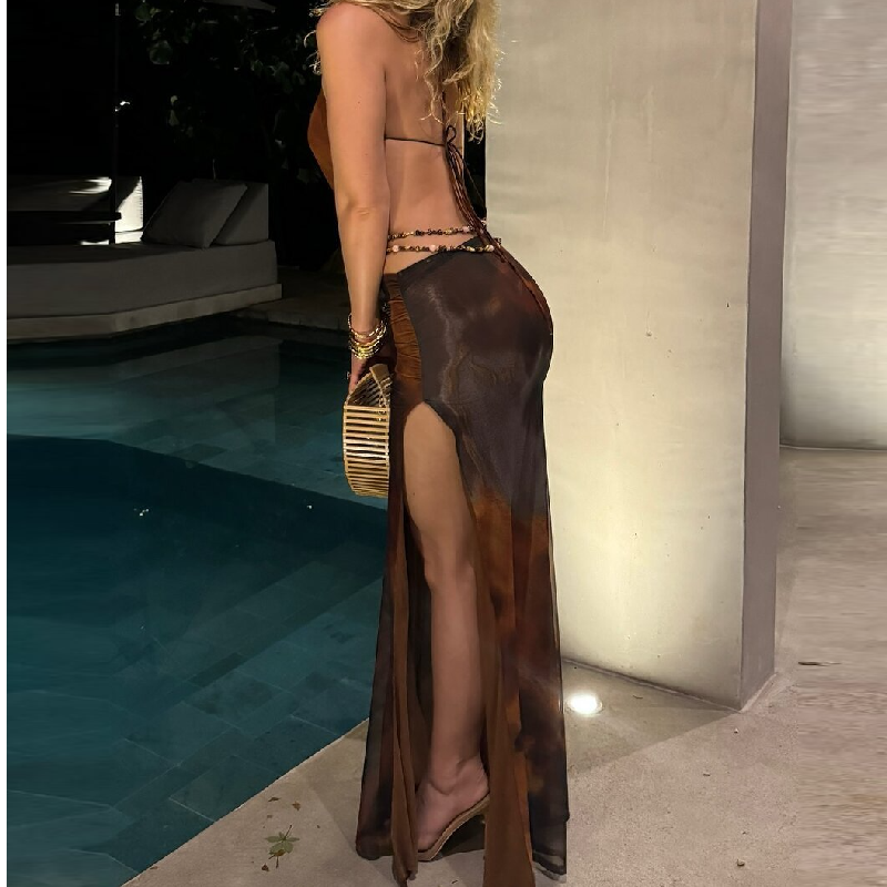Halter beaded backless slit contrast maxi dress