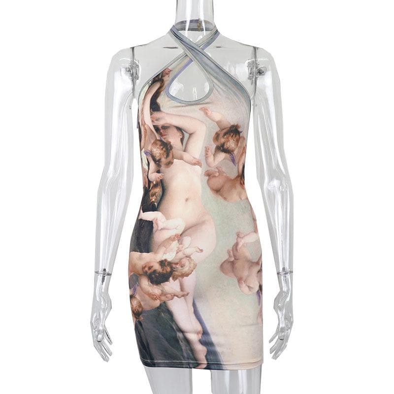 Halter ruched hollow out print backless cut out mini dress