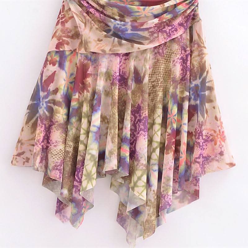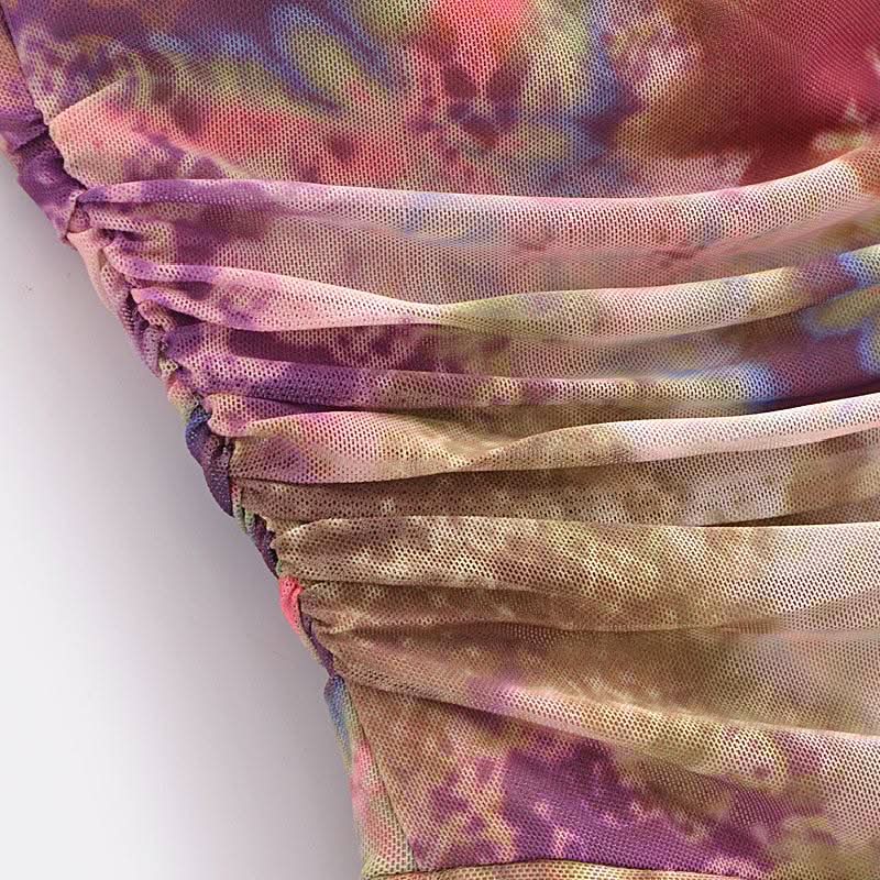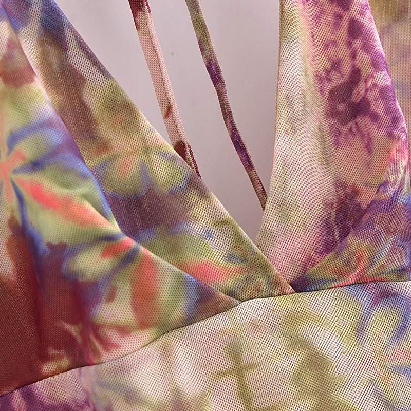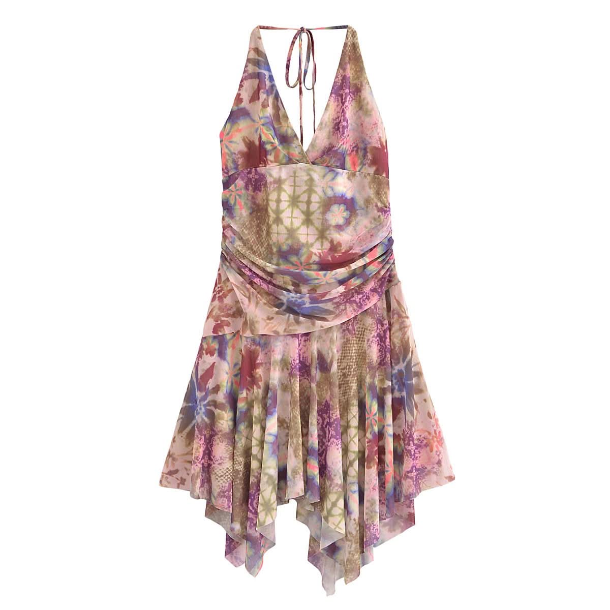 Halter self tie ruched print mesh v neck mini dress