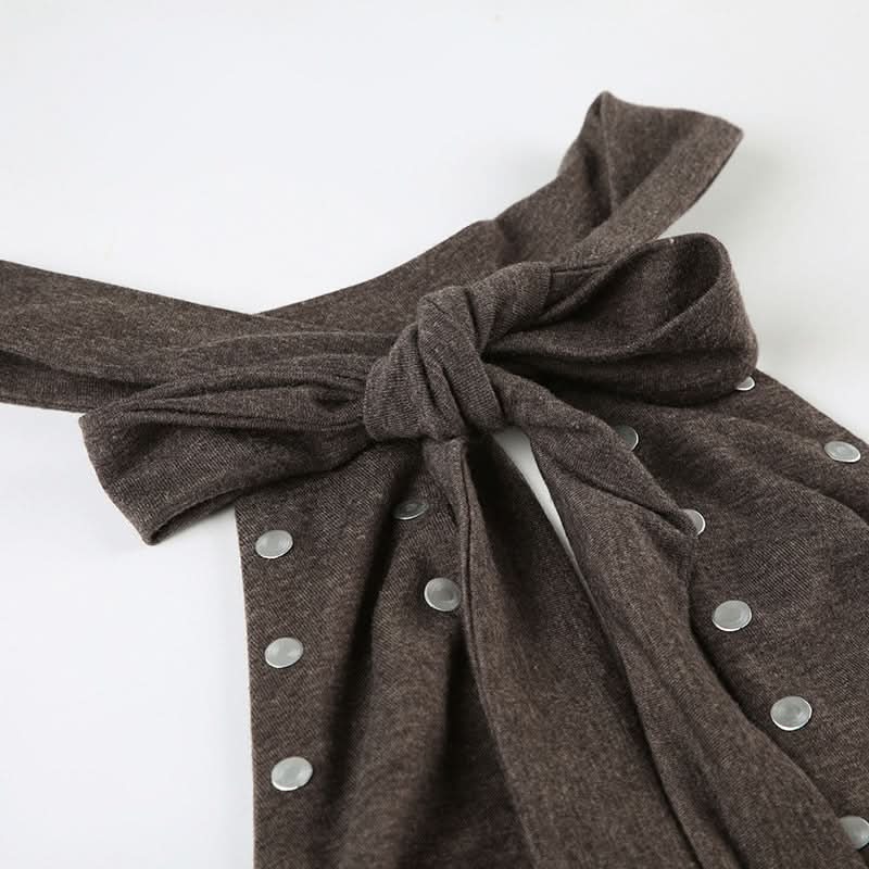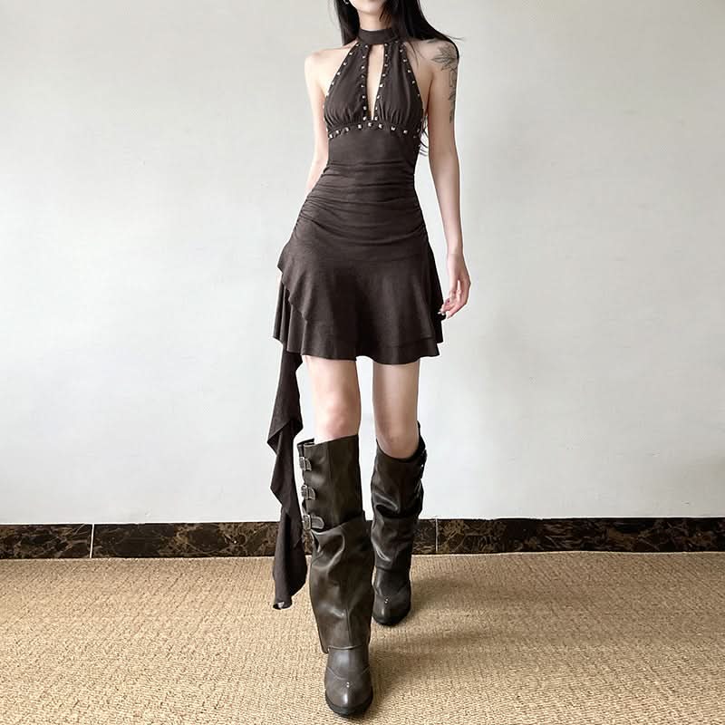 Hollow out ruched halter self tie cut out mini dress