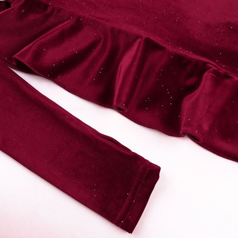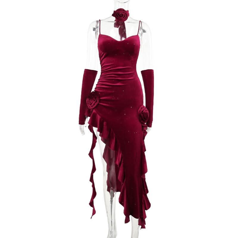 Irregular flower applique velvet v neck ruffle midi dress