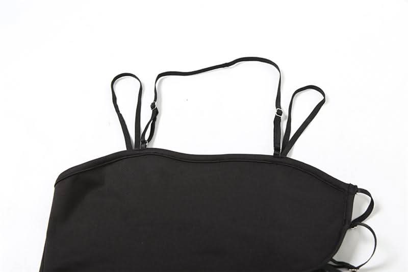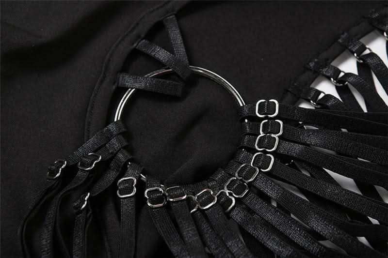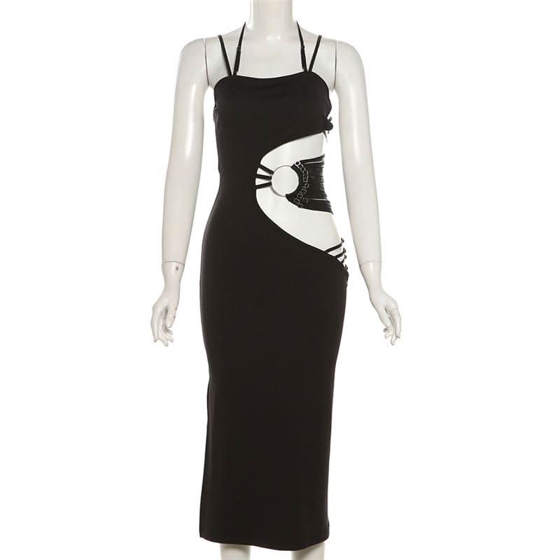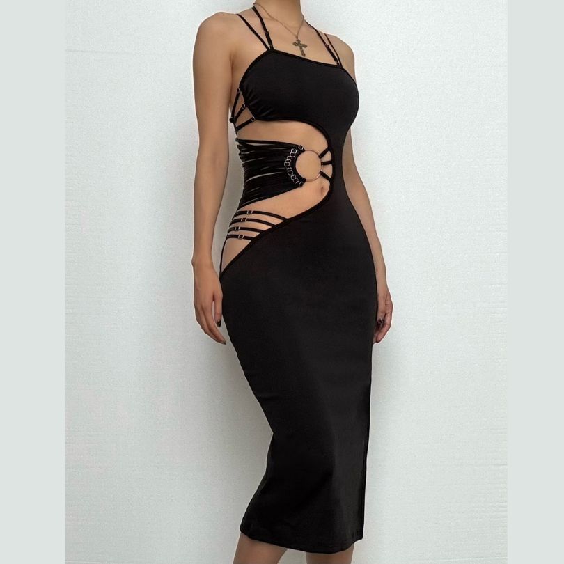 Irregular hollow out halter o ring cami slit cut out midi dress