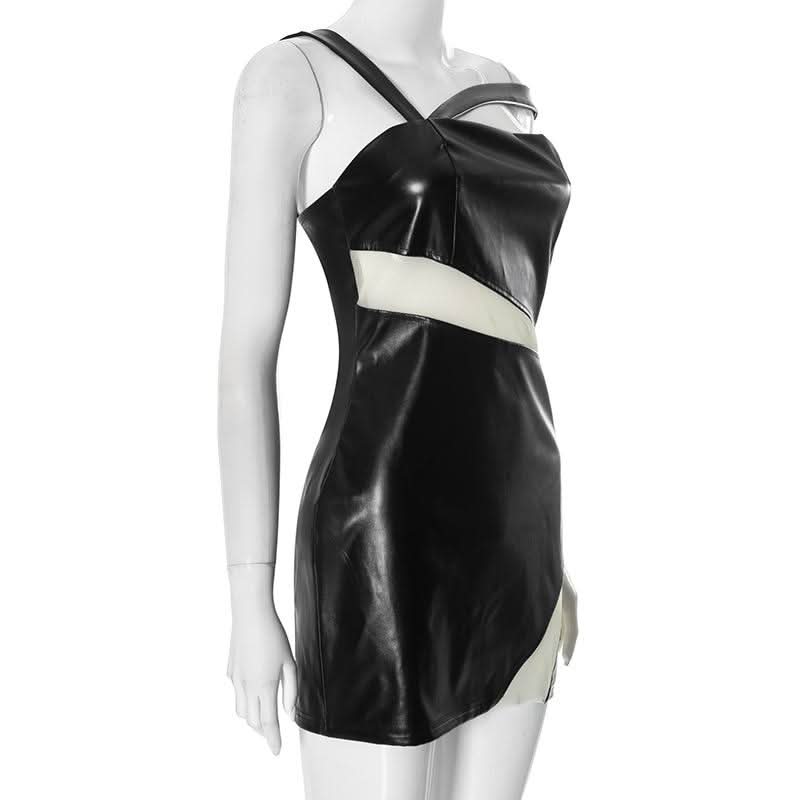 Irregular PU leather mesh zip-up mini dress