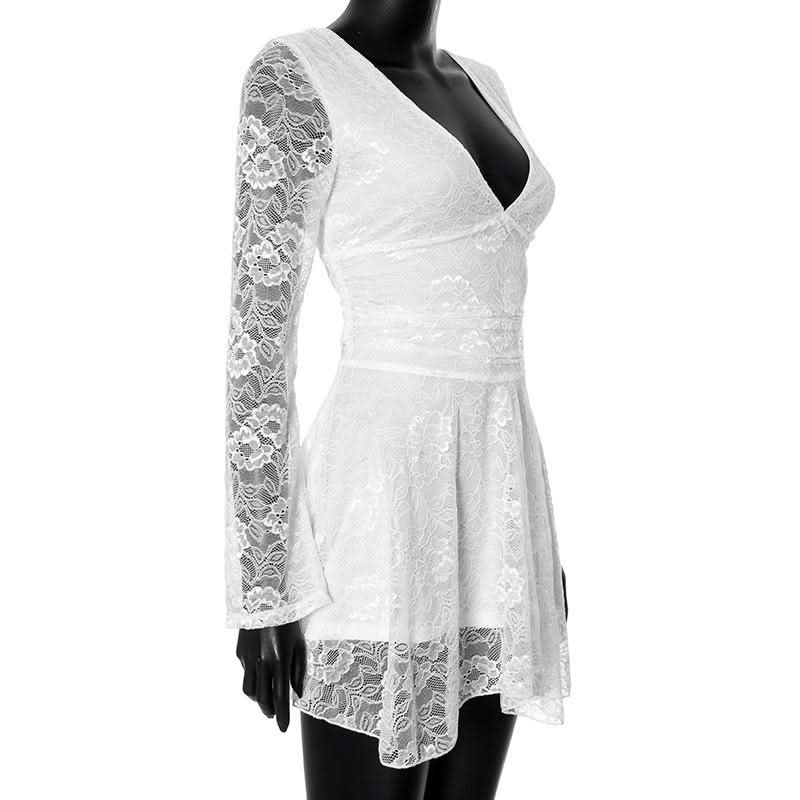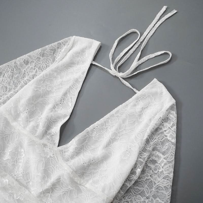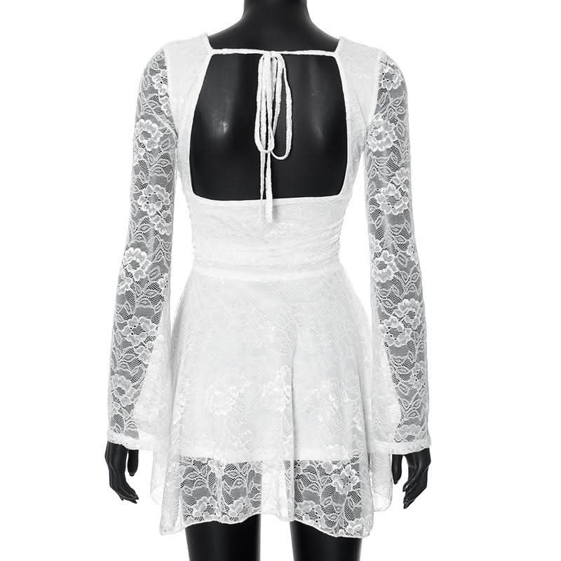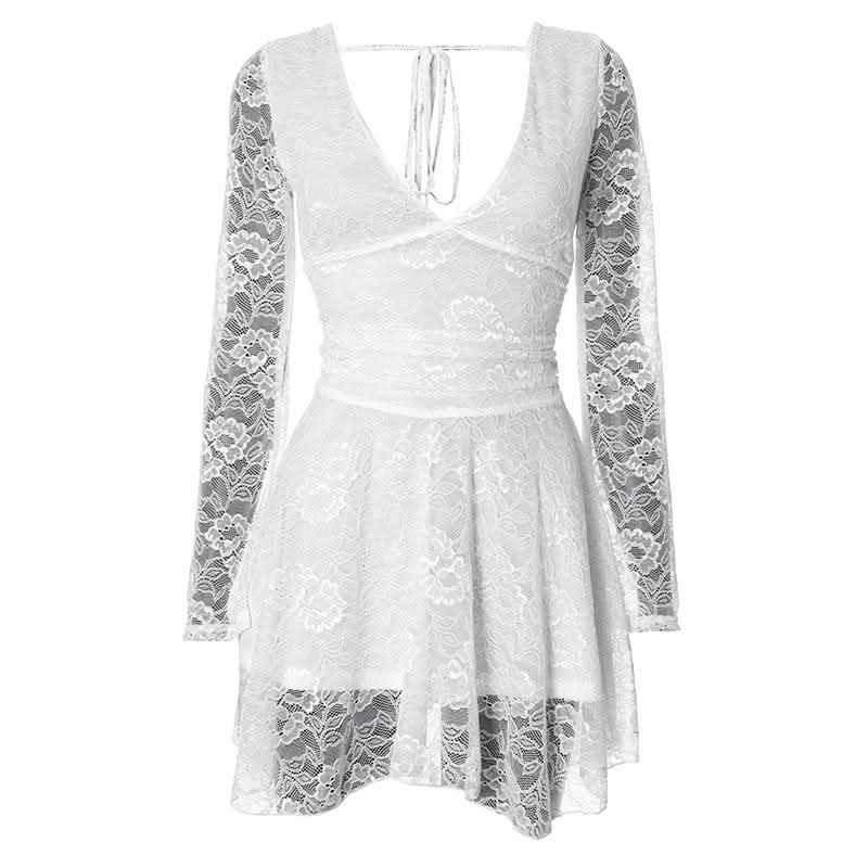 Lace v neck long sleeve self tie backless mini dress