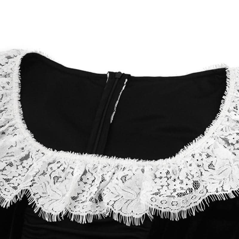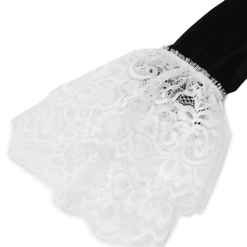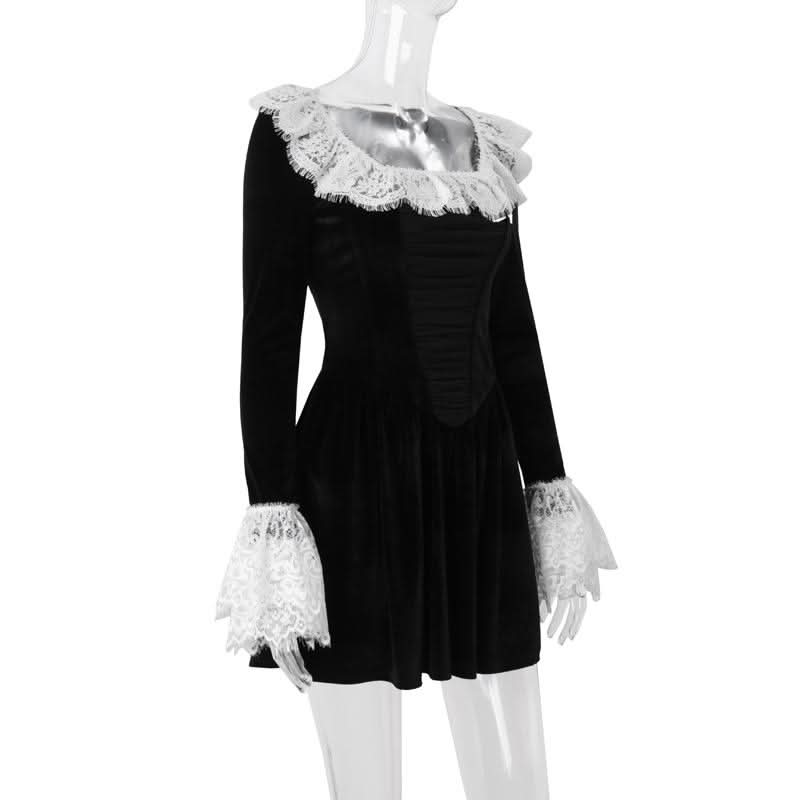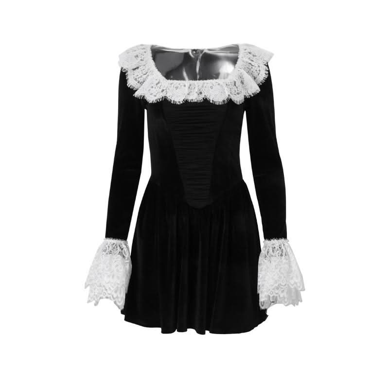 Long flared sleeve lace hem zip-up velvet mini dress