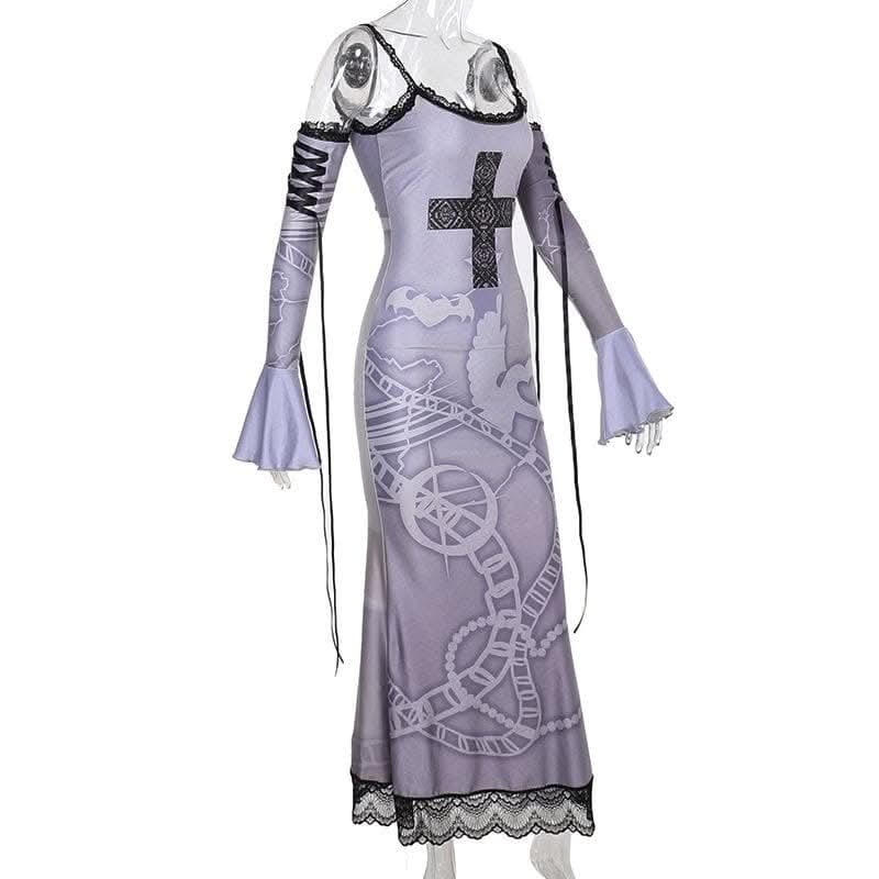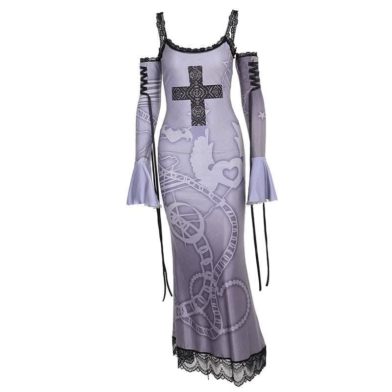 Long flared sleeve off shoulder cross print lace cami maxi dress-final-sale