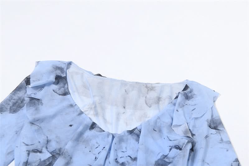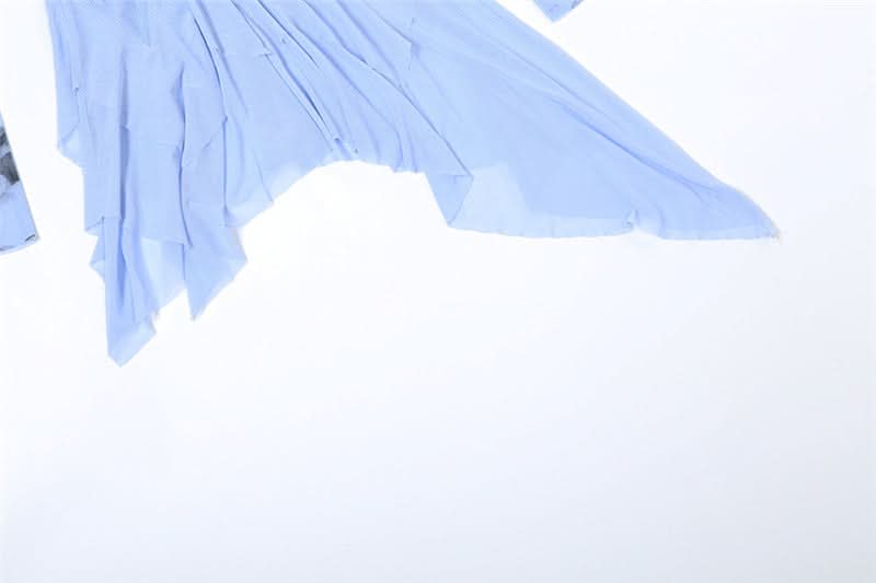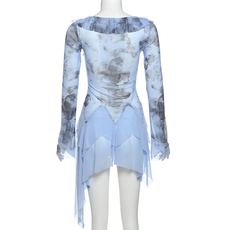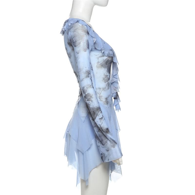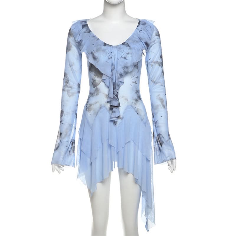 Long flared sleeve ruffle mesh mini dress