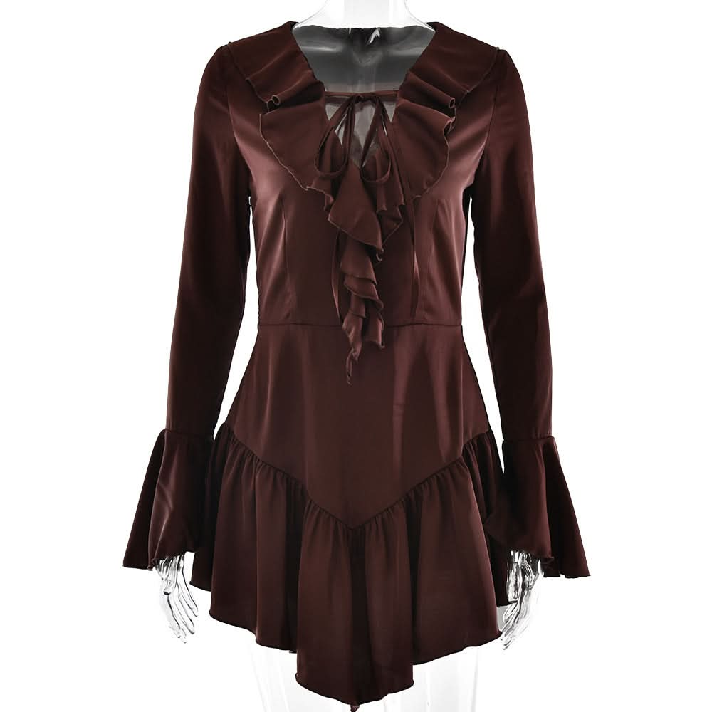 Long flared sleeve satin self tie ruffle ruched mini dress