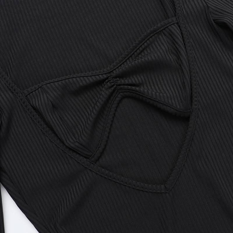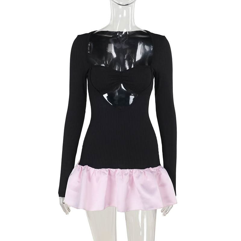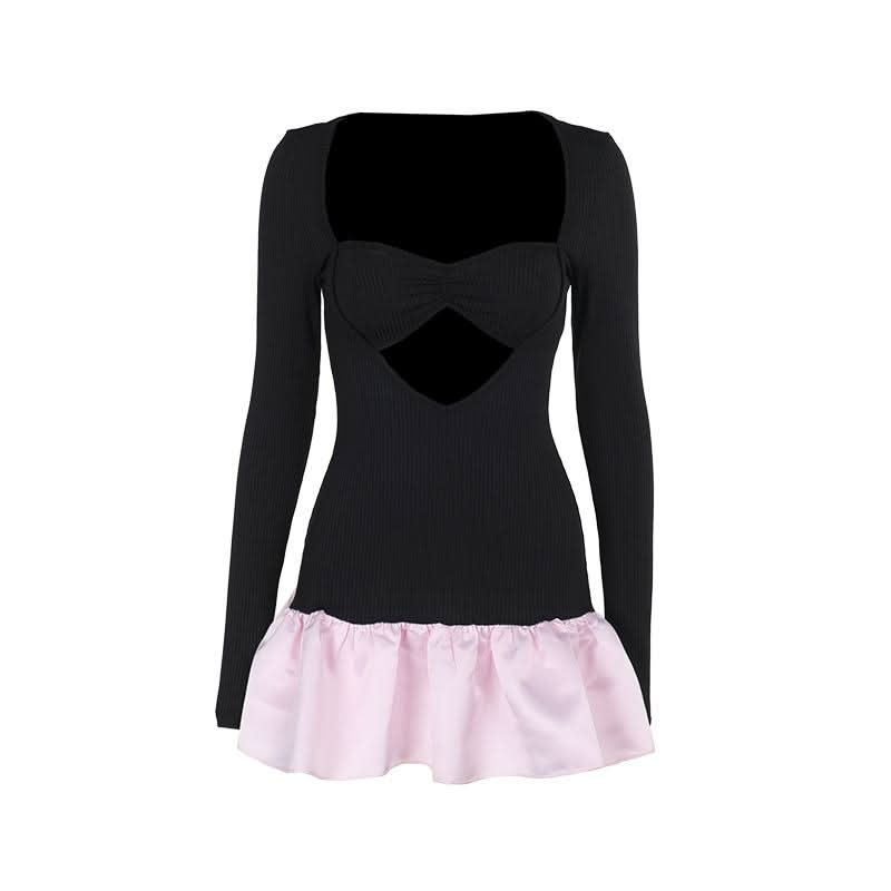 Long sleeve hollow out ribbed ruffle v neck cut out mini dress
