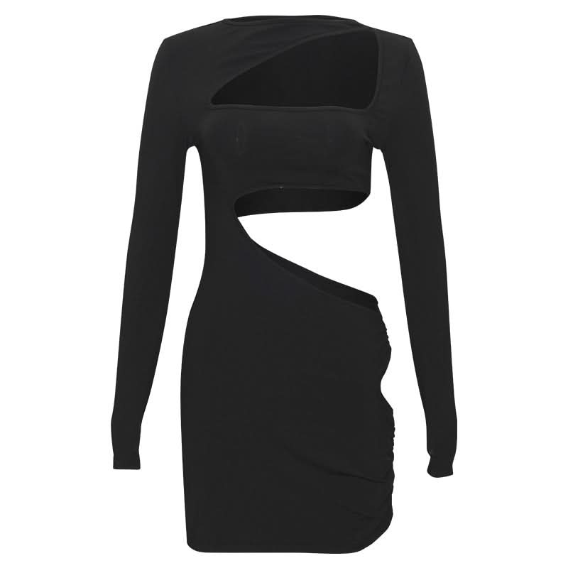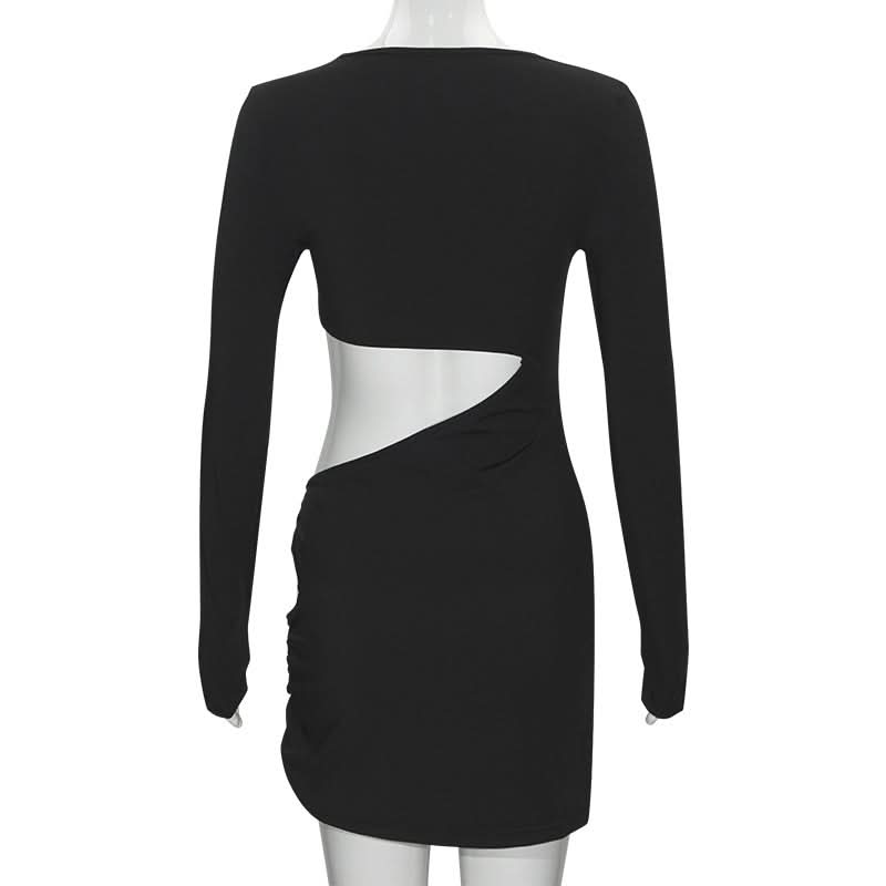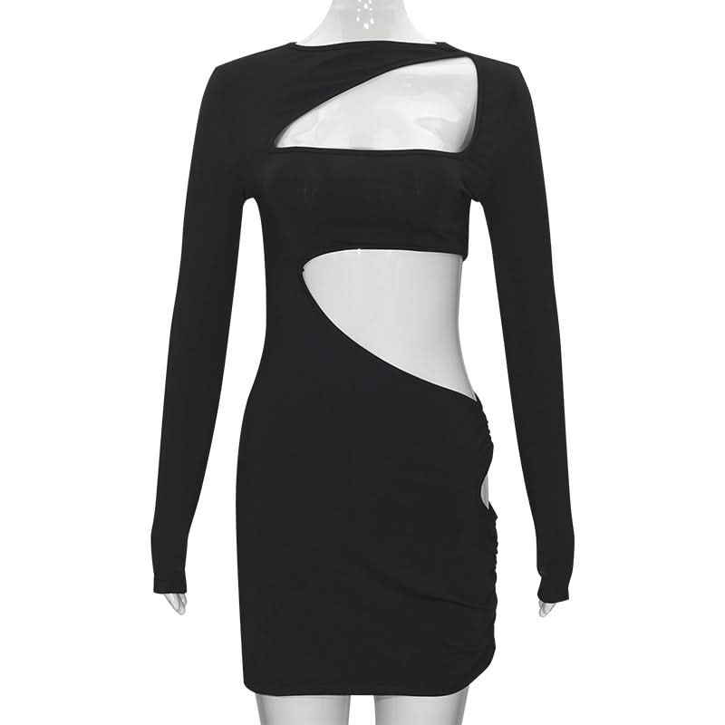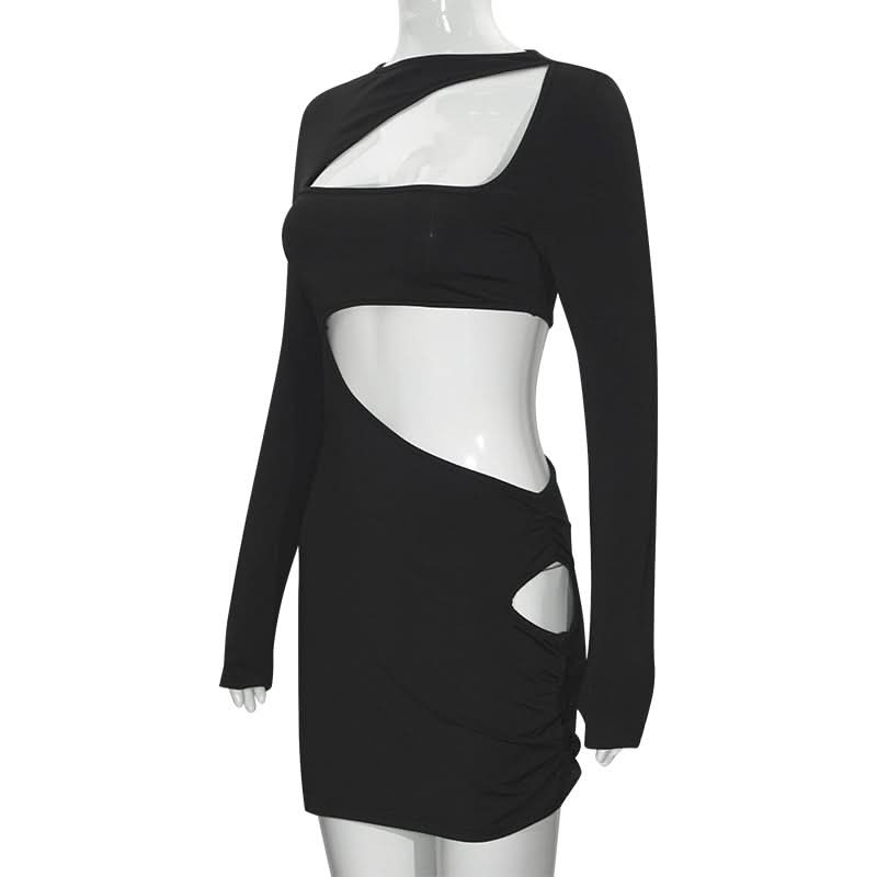 Long sleeve irregular hollow out ribbed cut out mini dress