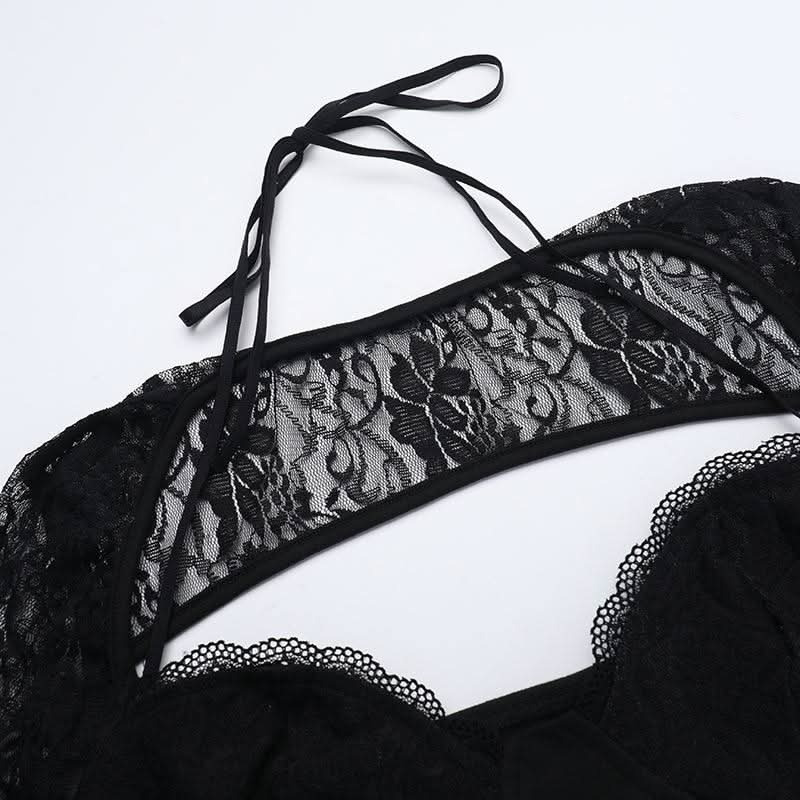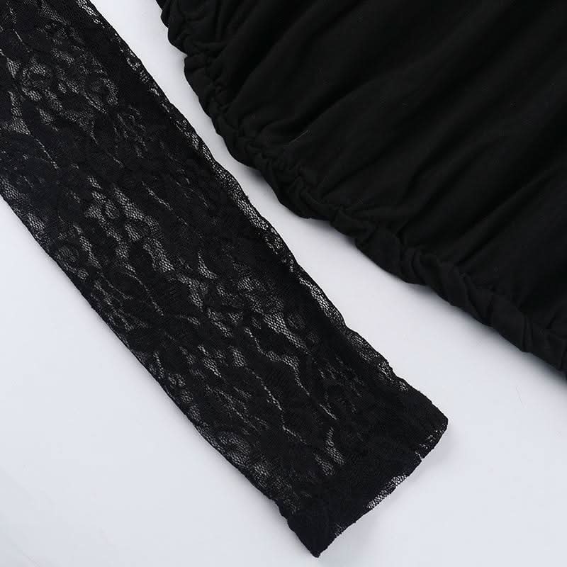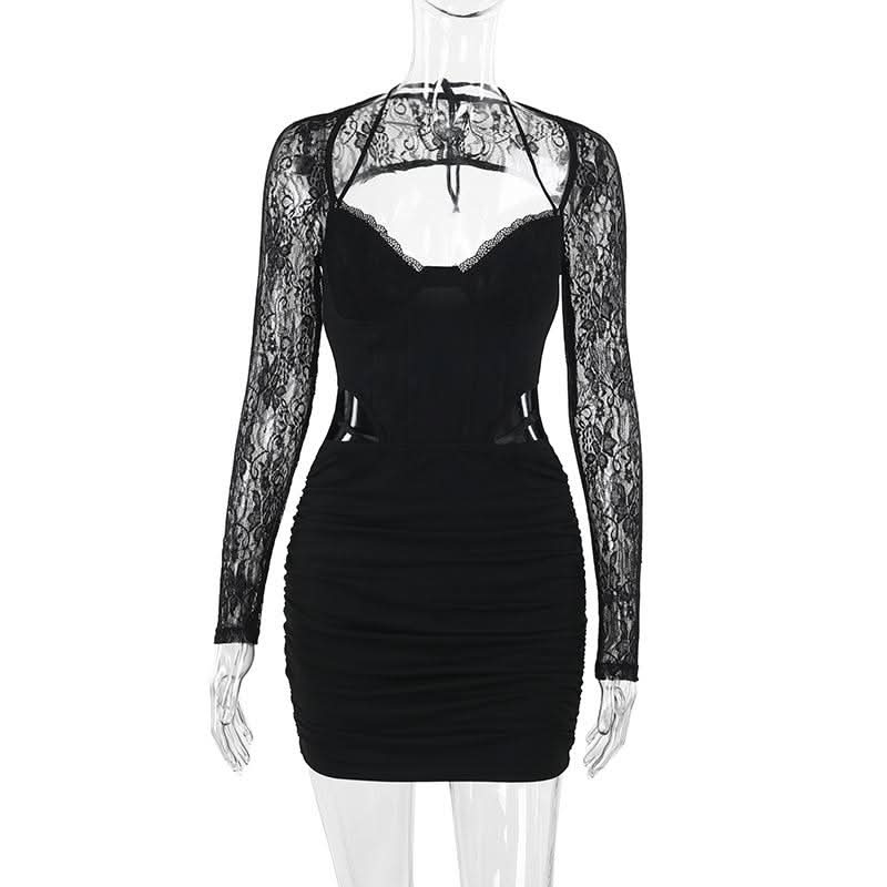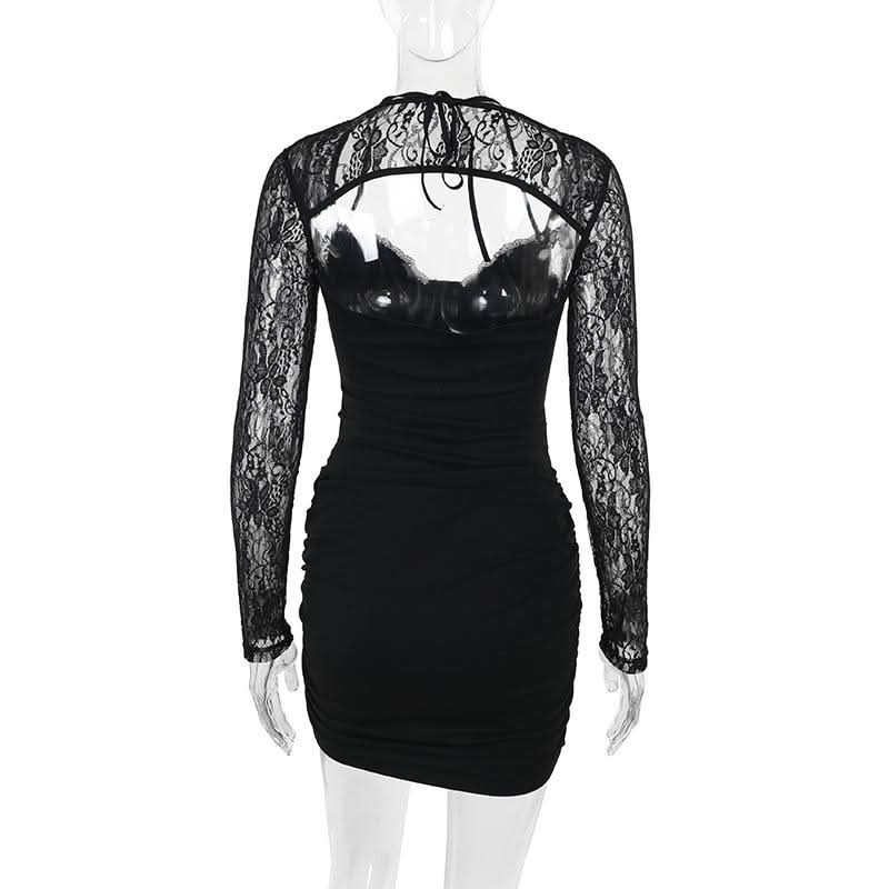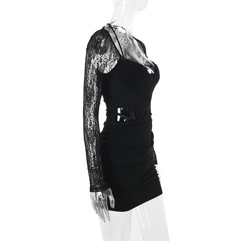 Long sleeve lace hollow out ruched self tie cut out mini dress