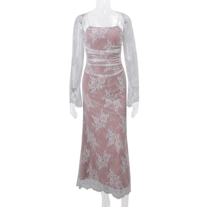 Long sleeve lace ruched shrug lace up 2 piece midi dress-final-sale