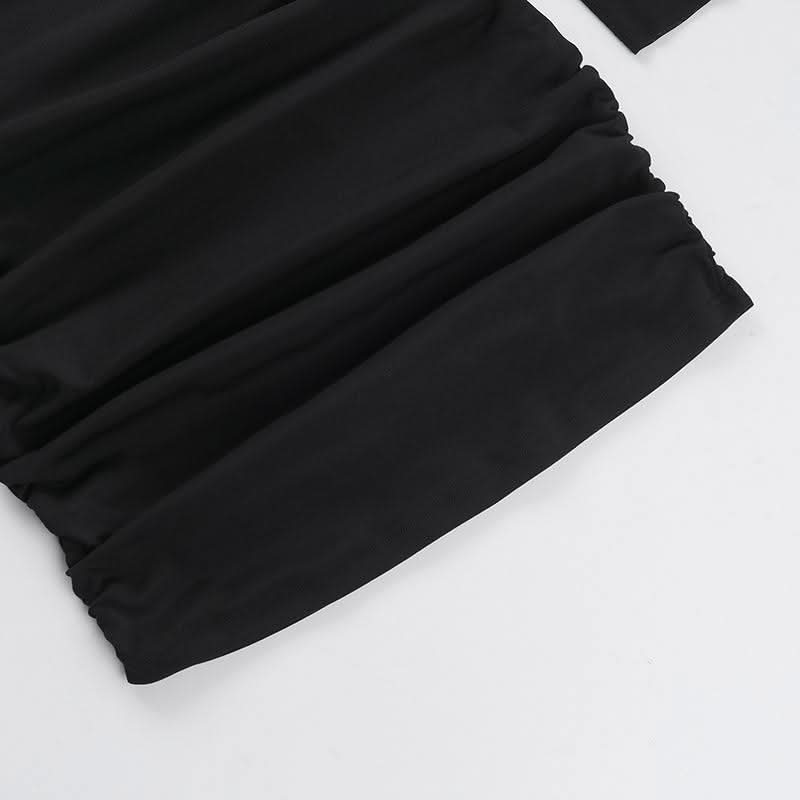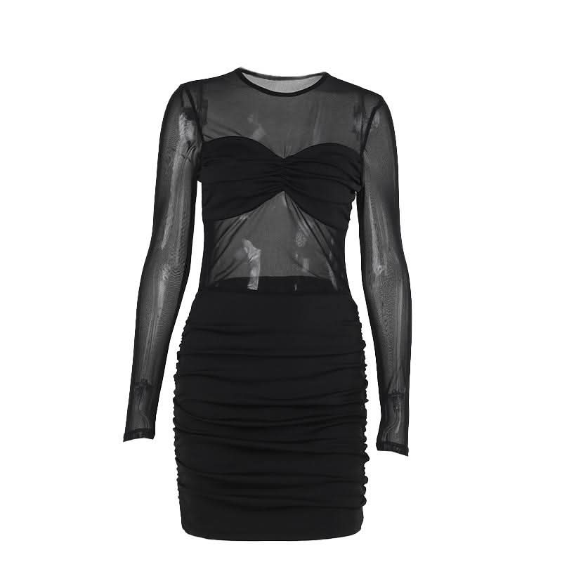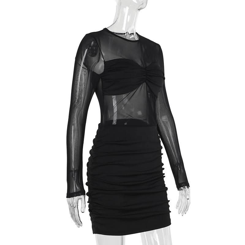 Long sleeve mesh patchwork ruched mini dress