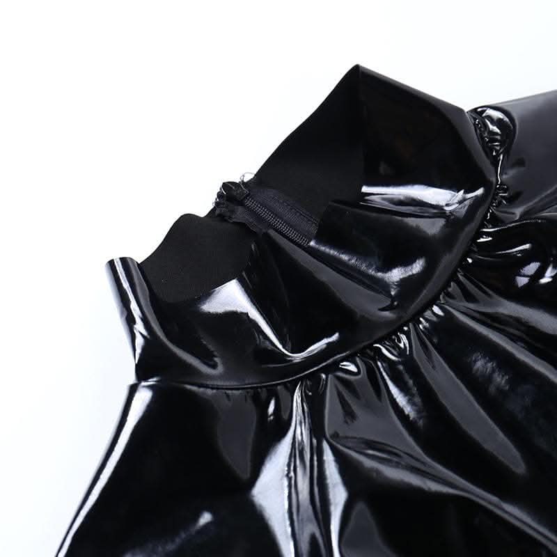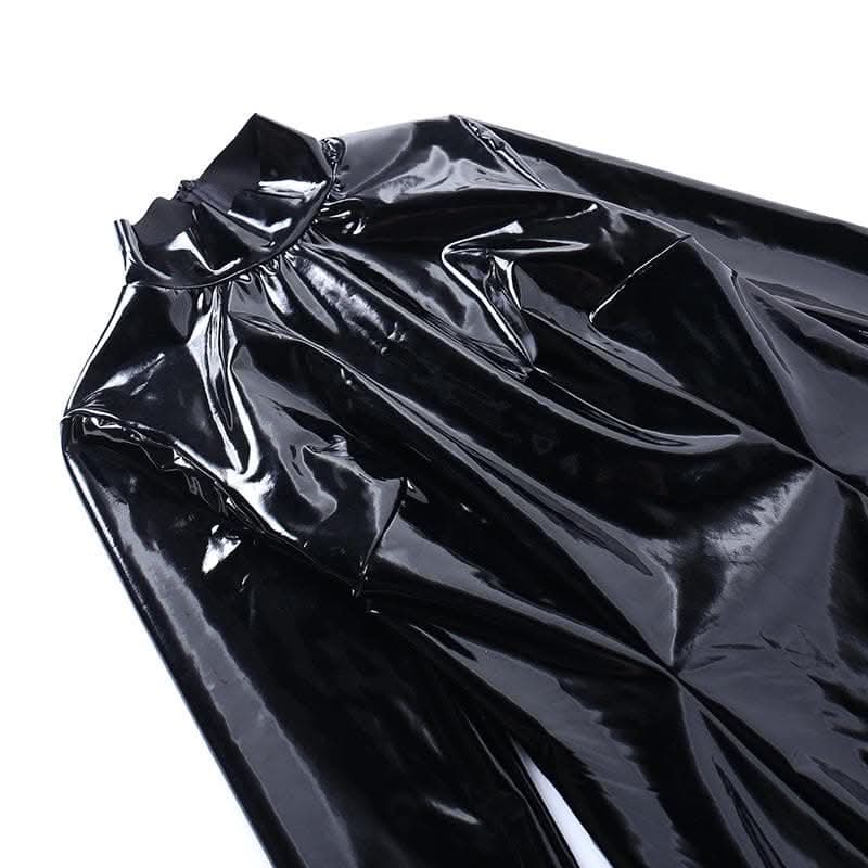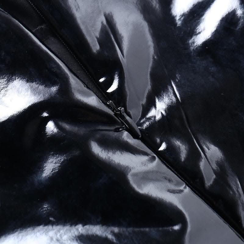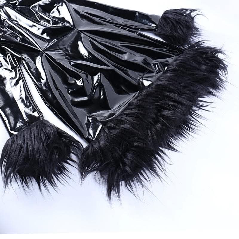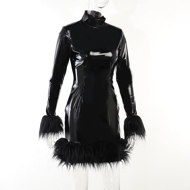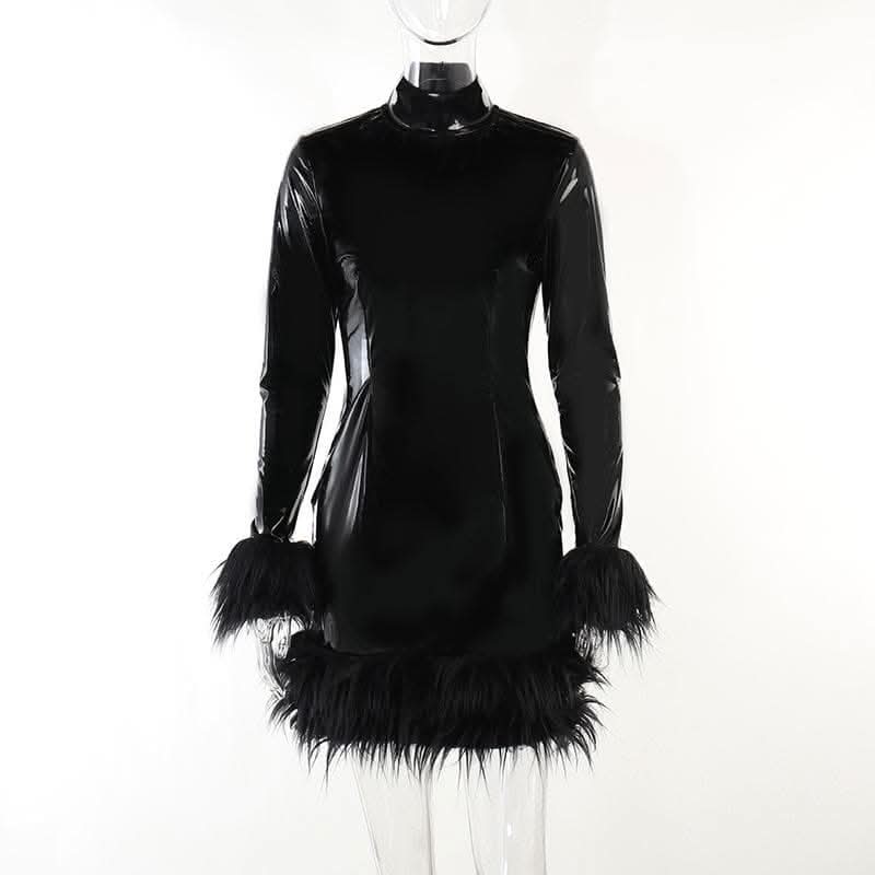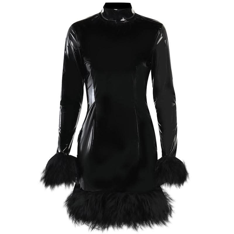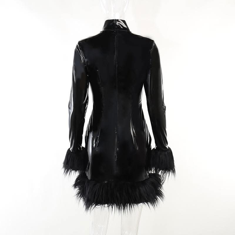 Long sleeve PU leather feather high neck zip-up mini dress-final-sale