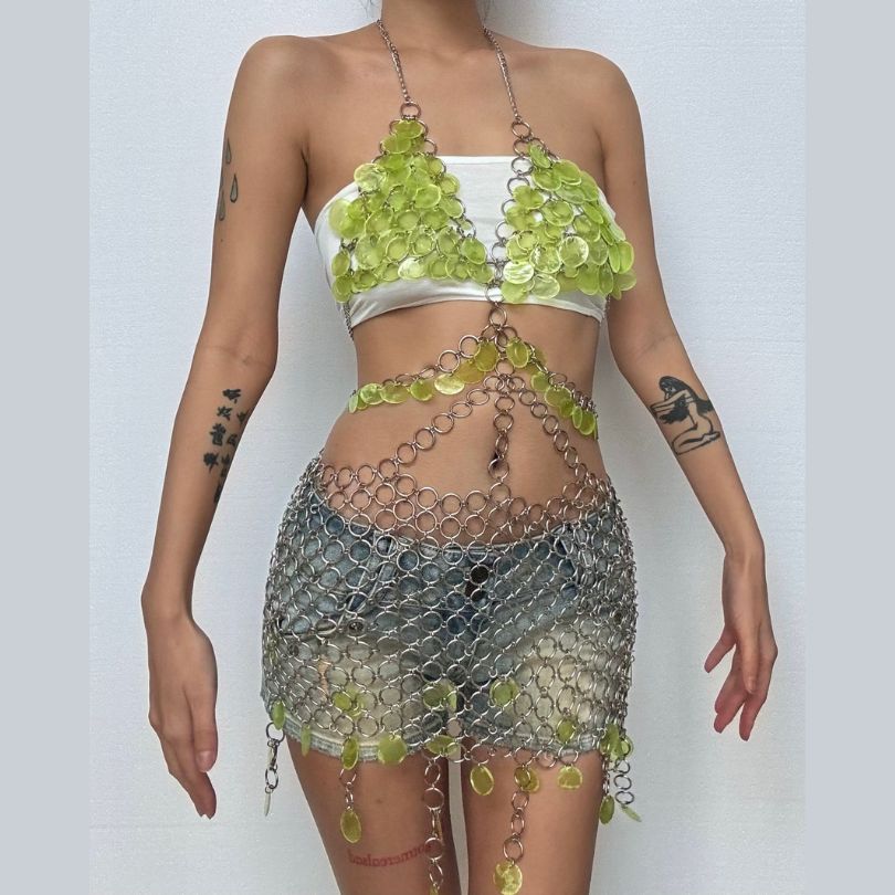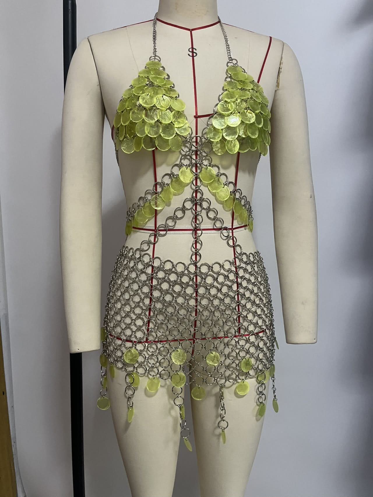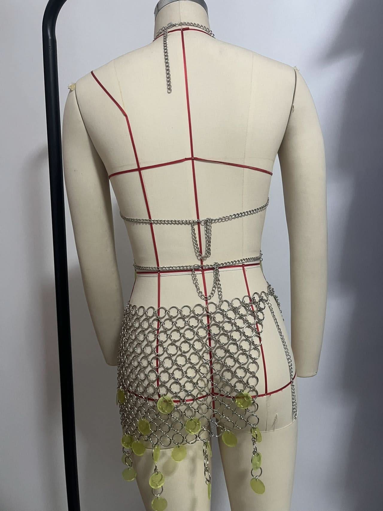 Metal chain v neck glitter o ring mini dress