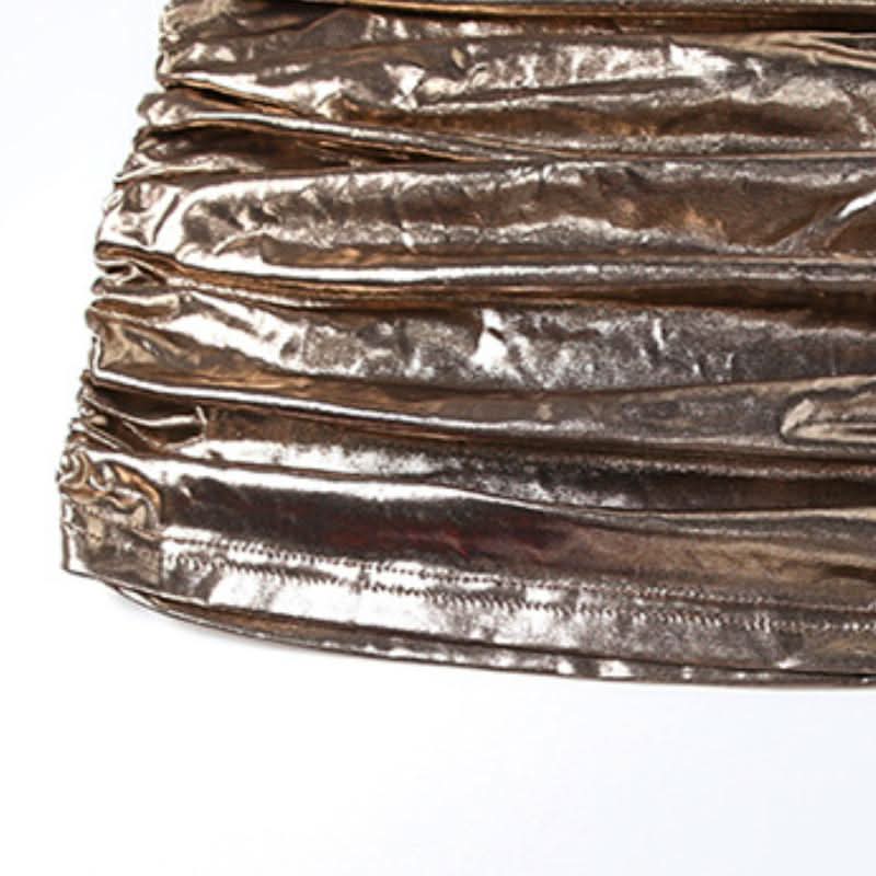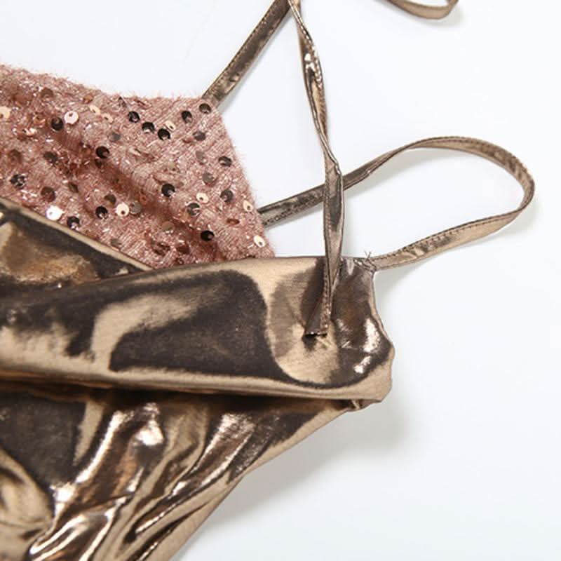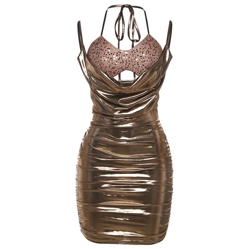 Metallic ruched glitter hollow out halter self tie cut out mini dress